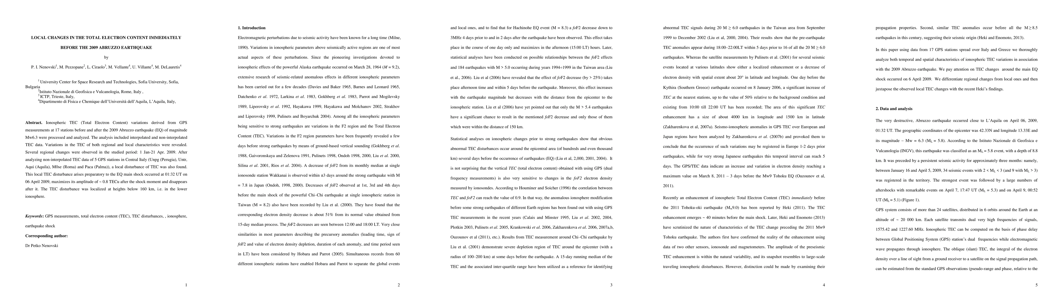 This study investigates ionospheric Total Electron Content (TEC) variations derived from GPS measurements before and after the 2009 Abruzzo earthquake. A local TEC disturbance was detected in the lower ionosphere, peaking just before the earthquake and diminishing afterward.