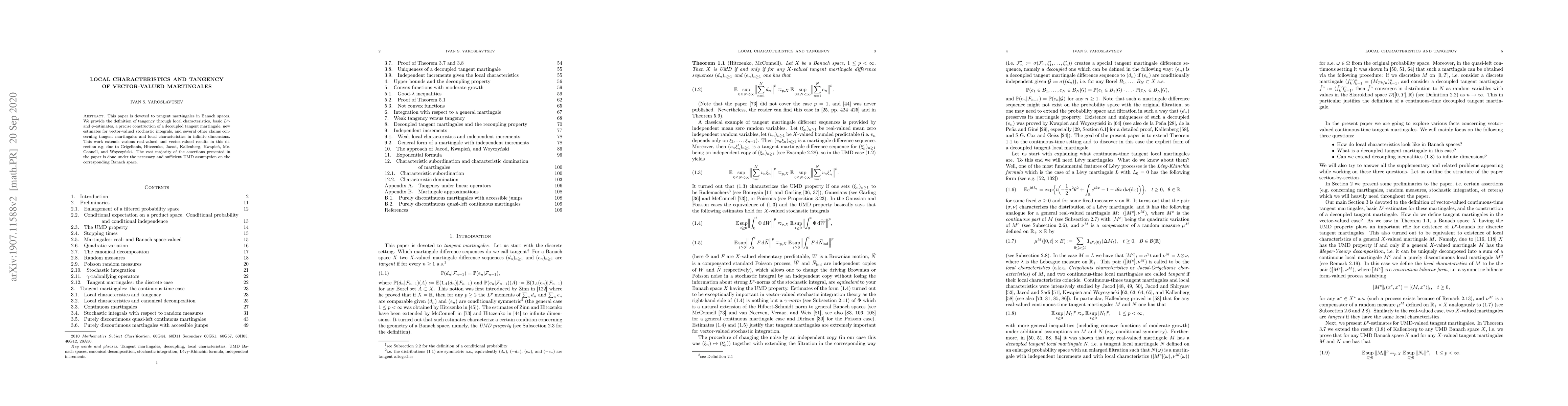 This paper is devoted to tangent martingales in Banach spaces. We provide the definition of tangency through local characteristics, basic $L^p$- and $\phi$-estimates, a precise construction of a decoupled tangent martingale, new estimates for vector-valued stochastic integrals, and several other claims concerning tangent martingales and local characteristics in infinite dimensions. This work extends various real-valued and vector-valued results in this direction e.g. due to Grigelionis, Hitczenko, Jacod, Kallenberg, Kwapie\'{n}, McConnell, and Woyczy\'{n}ski. The vast majority of the assertions presented in the paper is done under the sufficient and necessary UMD assumption on the corresponding Banach space.