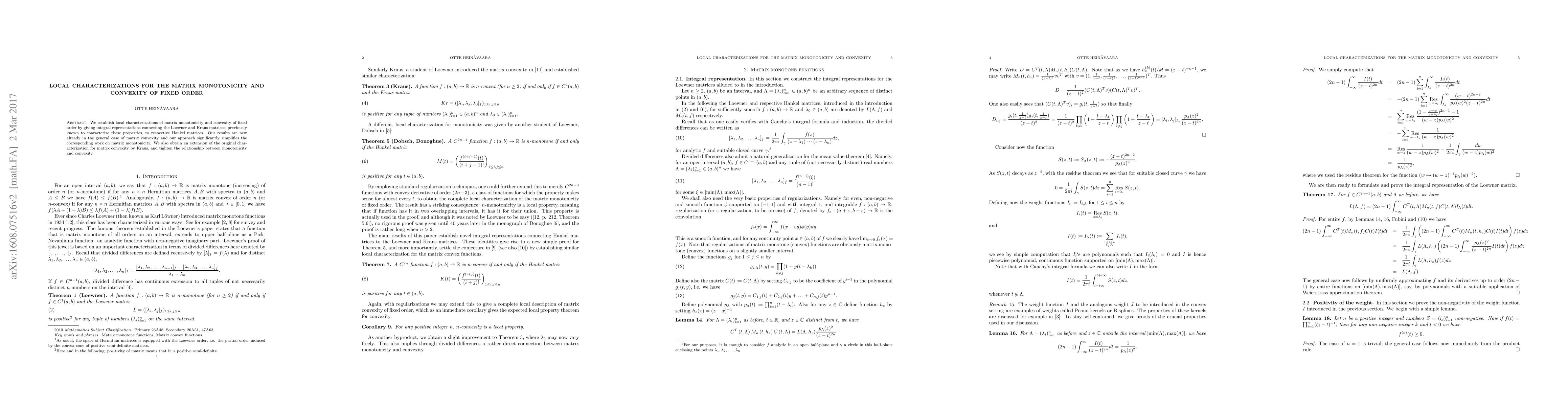 This paper provides new local characterizations of matrix monotonicity and convexity of fixed order through integral representations linking Loewner and Kraus matrices to Hankel matrices. The approach notably simplifies existing methods for matrix monotonicity and extends Kraus' original characterization for matrix convexity.