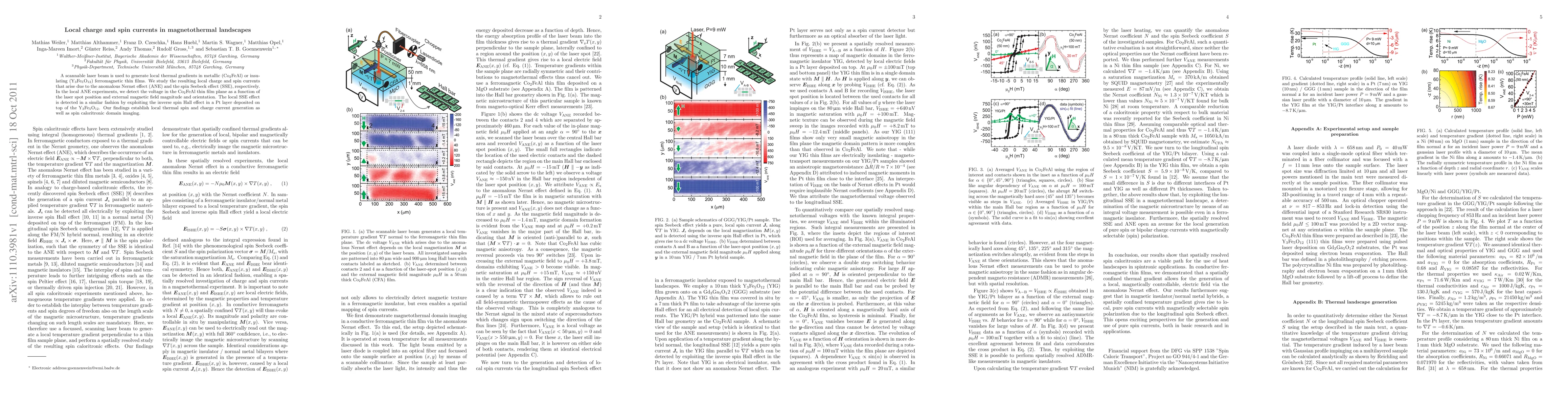 A scannable laser beam is used to generate local thermal gradients in metallic (Co2FeAl) or insulating (Y3Fe5O12) ferromagnetic thin films. We study the resulting local charge and spin currents that arise due to the anomalous Nernst effect (ANE) and the spin Seebeck effect (SSE), respectively. In the local ANE experiments, we detect the voltage in the Co2FeAl thin film plane as a function of the laser spot position and external magnetic field magnitude and orientation. The local SSE effect is detected in a similar fashion by exploiting the inverse spin Hall effect in a Pt layer deposited on top of the Y3Fe5O12. Our findings establish local thermal spin and charge current generation as well as spin caloritronic domain imaging.