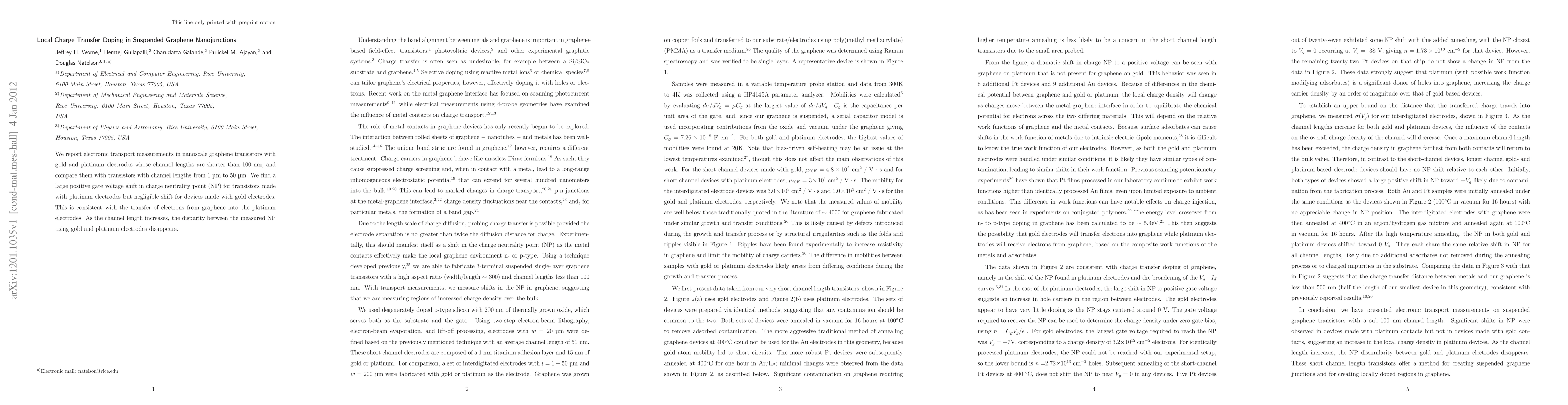Researchers studied graphene transistors with gold and platinum electrodes and found that platinum electrodes cause a large positive shift in the charge neutrality point, while gold electrodes have no effect. The disparity disappears as the channel length increases.