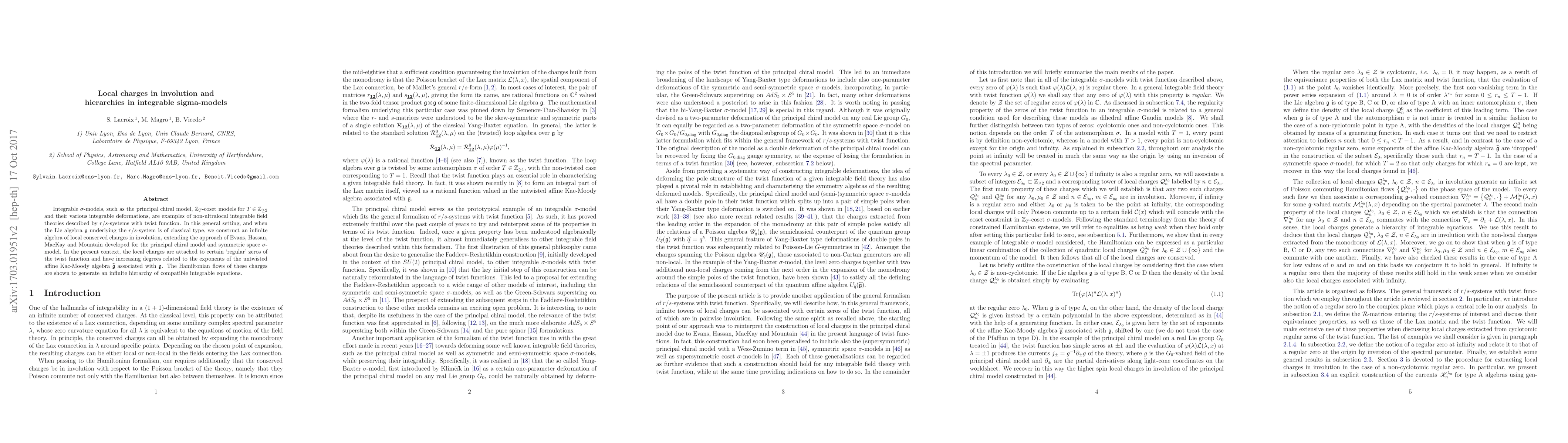 Integrable $\sigma$-models, such as the principal chiral model, ${\mathbb{Z}}_T$-coset models for $T \in {\mathbb{Z}}_{\geq 2}$ and their various integrable deformations, are examples of non-ultralocal integrable field theories described by (cyclotomic) $r/s$-systems with twist function. In this general setting, and when the Lie algebra ${\mathfrak{g}}$ underlying the $r/s$-system is of classical type, we construct an infinite algebra of local conserved charges in involution, extending the approach of Evans, Hassan, MacKay and Mountain developed for the principal chiral model and symmetric space $\sigma$-model. In the present context, the local charges are attached to certain `regular' zeros of the twist function and have increasing degrees related to the exponents of the untwisted affine Kac-Moody algebra $\widehat{{\mathfrak{g}}}$ associated with ${\mathfrak{g}}$. The Hamiltonian flows of these charges are shown to generate an infinite hierarchy of compatible integrable equations.