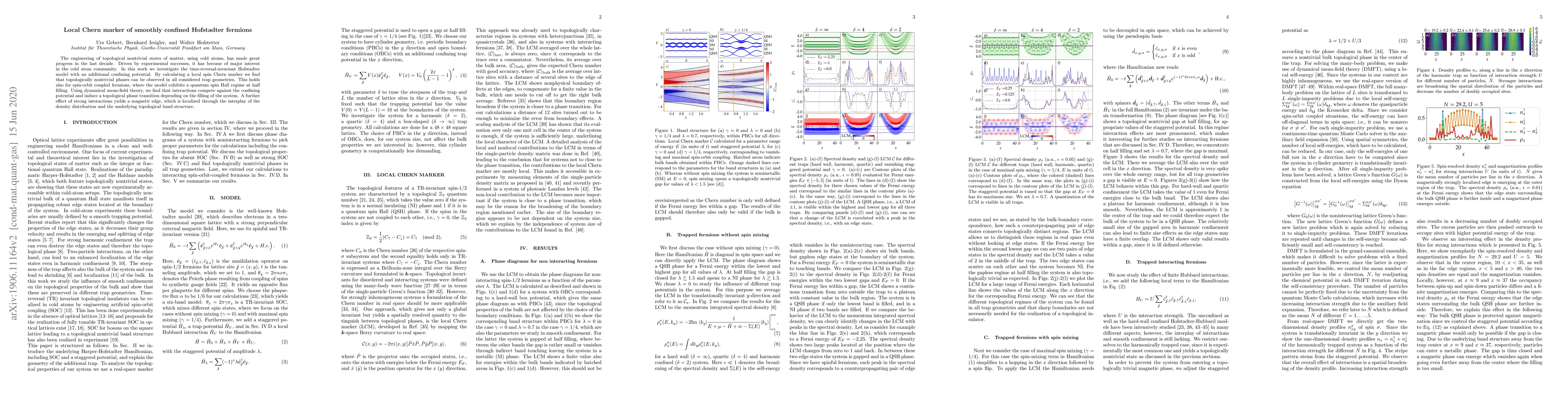 The engineering of topological non-trivial states of matter, using cold atoms, has made great progress in the last decade. Driven by experimental successes, it has become of major interest in the cold atom community. In this work we investigate the time-reversal invariant Hofstadter model with an additional confining potential. By calculating a local spin Chern marker we find that topologically non-trivial phases can be observed in all considered trap geometries. This holds also for spin-orbit coupled fermions, where the model exhibits a quantum spin Hall regime at half filling. Using dynamical mean-field theory, we find that interactions compete against the confining potential and induce a topological phase transition depending on the filling of the system. Strong interactions furthermore yield a magnetic edge, which is localized through the interplay of the density distribution and the underlying topological band structure.