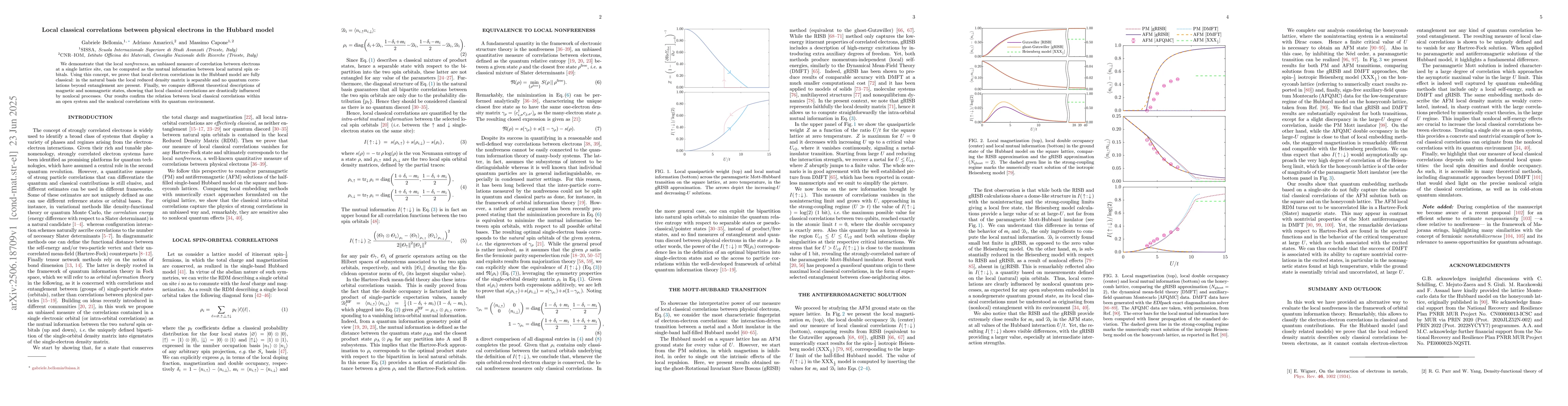 We demonstrate that the local nonfreeness, an unbiased measure of correlation between electrons at a single lattice site, can be computed as the mutual information between local natural spin orbitals. Using this concept, we prove that local electron correlations in the Hubbard model are fully classical: in the natural basis the local reduced density matrix is separable and no quantum correlations beyond entanglement are present. Finally, we compare different theoretical descriptions of magnetic and nonmagnetic states, showing that local classical correlations are drastically influenced by nonlocal processes. Our results confirm the relation between local classical correlations within an open system and the nonlocal correlations with its quantum environment.