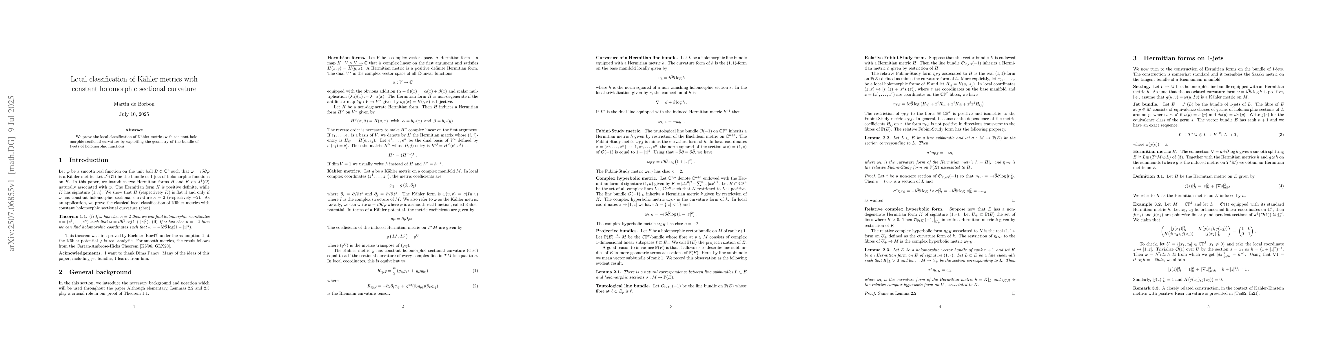 We prove the local classification of K\"ahler metrics with constant holomorphic sectional curvature by exploiting the geometry of the bundle of 1-jets of holomorphic functions.