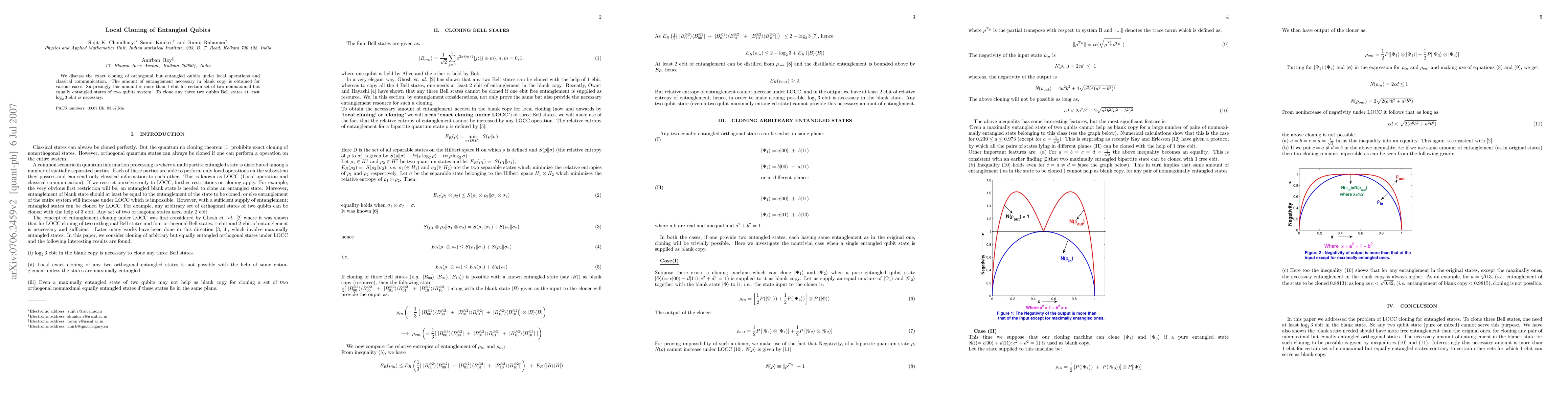 This paper explores the exact cloning of entangled qubits using local operations and classical communication, revealing that more than 1 ebit of entanglement is required for certain entangled states, and at least log2 3 ebit is necessary to clone three two-qubit Bell states.
