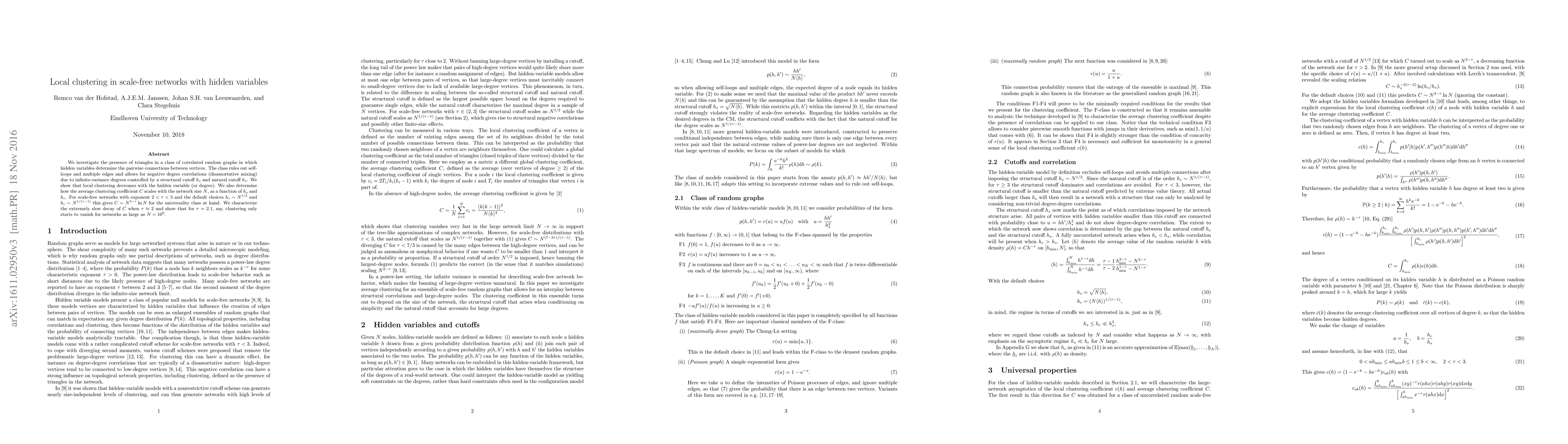This research examines triangle formation in a specific type of correlated random graph, where hidden variables govern vertex connections. It reveals that local clustering diminishes with the hidden variable or degree. The study also determines the scaling of the average clustering coefficient with network size, finding that for scale-free networks with exponent 2< au<3 and specified cutoffs, clustering coefficient C scales as N^(2- au)lnN. Notably, for au close to 2, clustering persists extremely slowly even in very large networks.