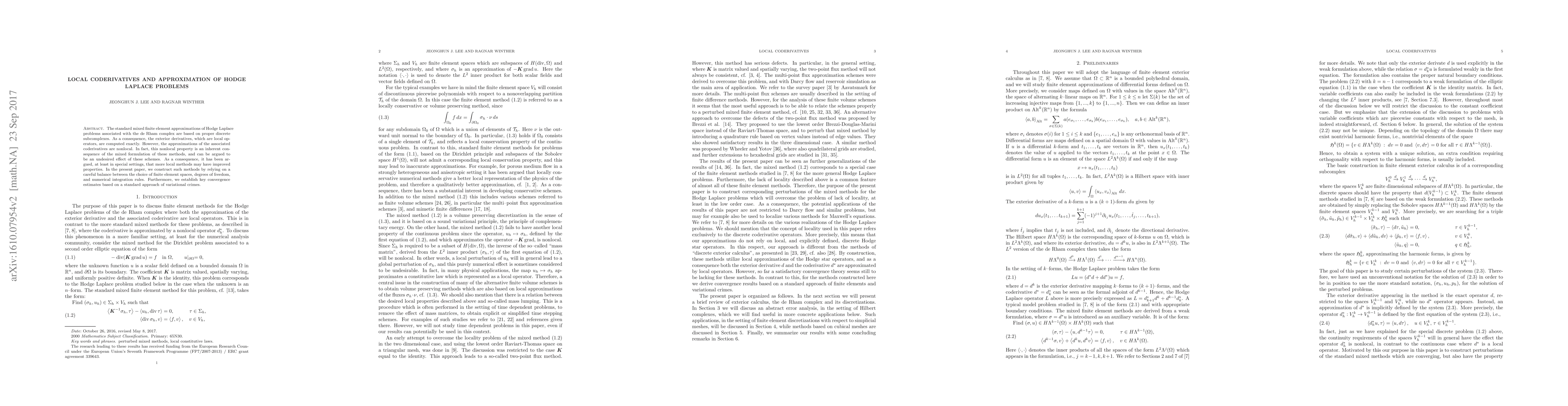 A new approach to solving Hodge Laplace problems using more local methods has been developed, offering improved properties over existing nonlocal methods. The new method balances finite element spaces, degrees of freedom, and numerical integration rules to achieve better convergence estimates.