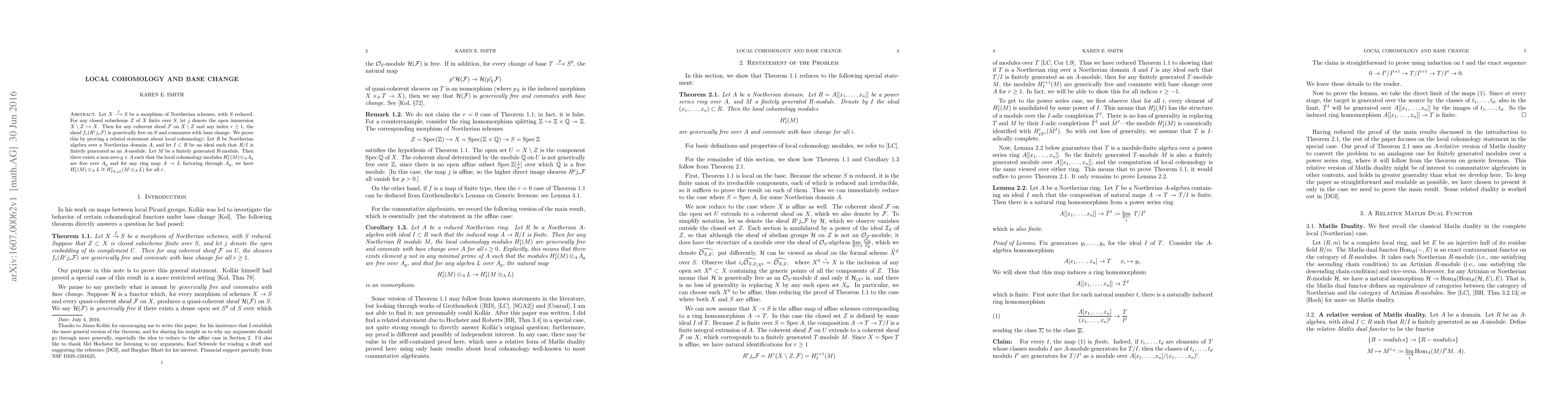 Let $X \overset{f}\longrightarrow S$ be a morphism of Noetherian schemes, with $S$ reduced. For any closed subscheme $Z$ of $X$ finite over $S$, let $j$ denote the open immersion $X\setminus Z \hookrightarrow X$. Koll\'ar asked whether for any coherent sheaf $\mathcal F$ on $X\setminus Z$ and any index $r\geq 1$, the sheaf $f_*(R^rj_*\mathcal F)$ is generically free on $S$ and commutes with base change. We answer this affirmatively, by proving a related statement about local cohomology: Let $ R$ be Noetherian algebra over a Noetherian domain $A$, and let $I \subset R$ be an ideal such that $ R/I $ is finitely generated as an $A$-module. Let $M$ be a finitely generated $R$-module. Then there exists a non-zero $g \in A$ such that the local cohomology modules $H^r_I(M) \otimes_A A_g$ are free over $A_g$ and for any ring map $A\rightarrow L$ factoring through $A_g$, we have $H^r_I(M) \otimes_A L \cong H^r_{I{\otimes_A}L}(M\otimes_A L)$ for all $r$.