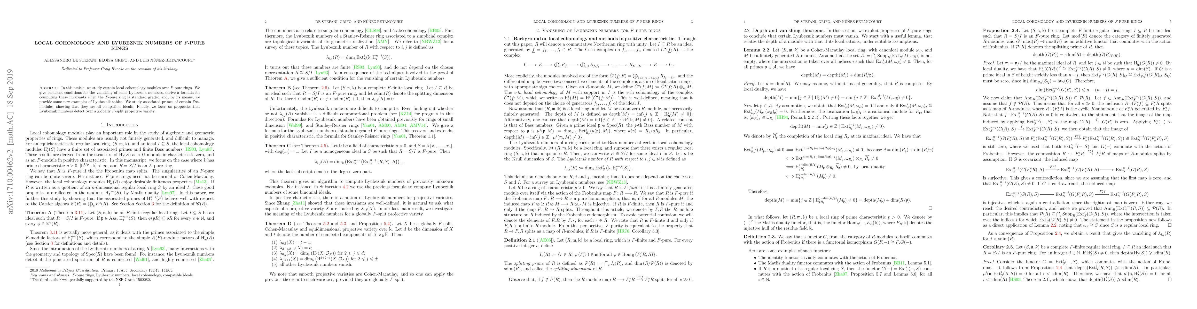 This paper investigates local cohomology modules over $F$-pure rings, establishes conditions for the vanishing of Lyubeznik numbers, and provides a formula for computing these invariants in standard graded $F$-pure rings. It also examines associated primes of Ext-modules and discusses properties detected by Lyubeznik numbers in globally $F$-split projective varieties.