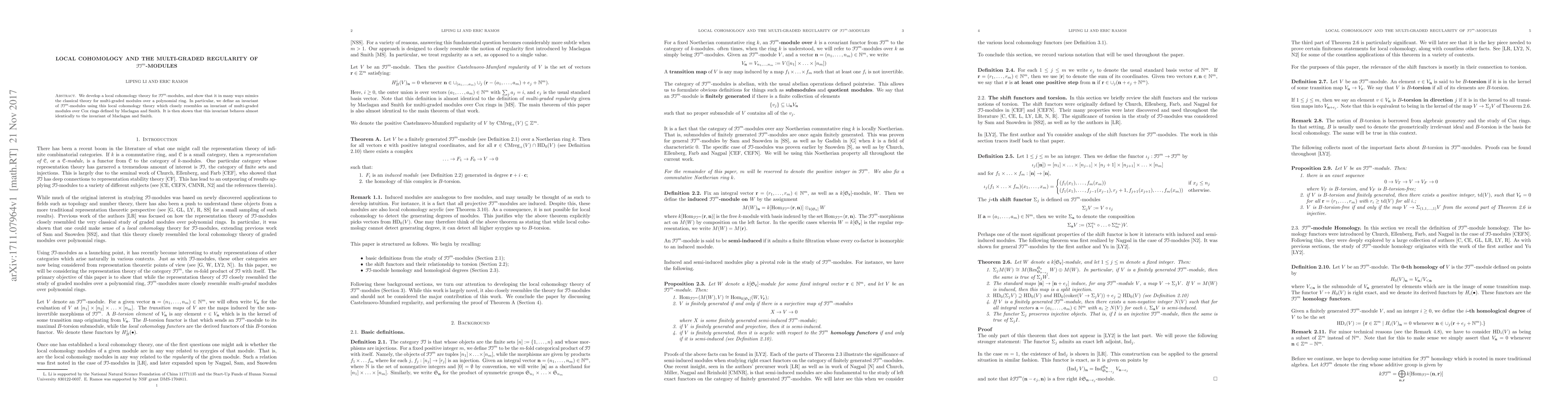 This paper develops a local cohomology theory for FI$^m$-modules that mirrors classical local cohomology for multi-graded modules. It defines an invariant using this theory that closely resembles an invariant for Cox rings, showing similar behavior.