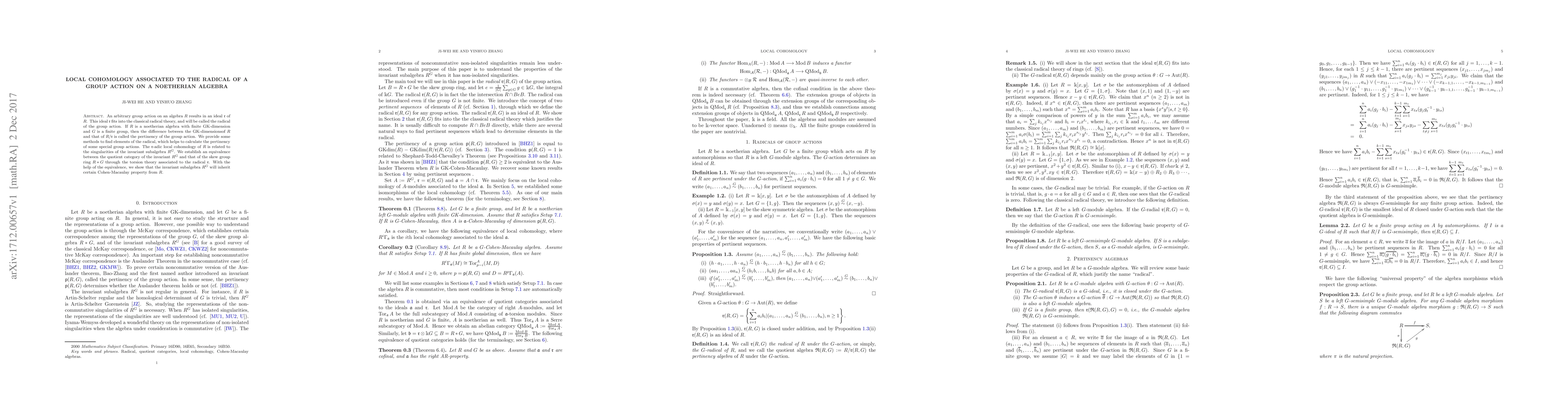 An arbitrary group action on an algebra $R$ results in an ideal $\mathfrak{r}$ of $R$. This ideal $\mathfrak{r}$ fits into the classical radical theory, and will be called the radical of the group action. If $R$ is a noetherian algebra with finite GK-dimension and $G$ is a finite group, then the difference between the GK-dimensionsof $R$ and that of $R/\mathfrak{r}$ is called the pertinency of the group action. We provide some methods to find elements of the radical, which helps to calculate the pertinency of some special group actions. The $\mathfrak{r}$-adic local cohomology of $R$ is related to the singularities of the invariant subalgebra $R^G$. We establish an equivalence between the quotient category of the invariant $R^G$ and that of the skew group ring $R*G$ through the torsion theory associated to the radical $\mathfrak{r}$. With the help of the equivalence, we show that the invariant subalgebra $R^G$ will inherit certain Cohen-Macaulay property from $R$.