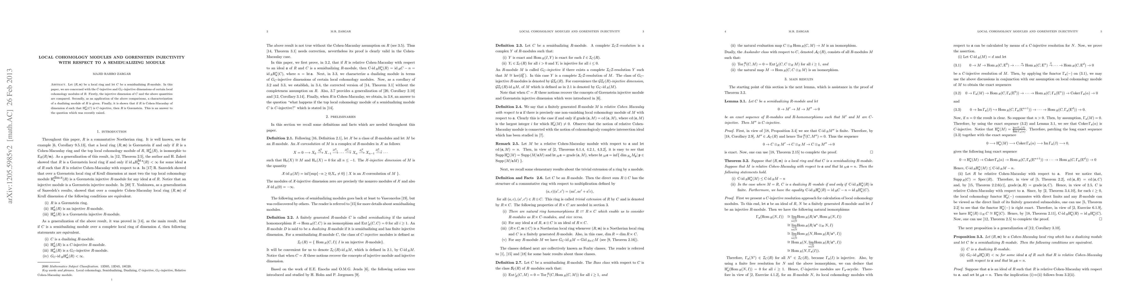 Let $(R,\fm)$ be a local ring and let $C$ be a semidualizing $R$--module. In this paper, we are concerned in $C$--injective and $G_{C}$--injective dimensions of certain local cohomology modules of $R$. Firstly, the injective dimension of $C$ and the above quantities of dimensions is compared. Then, as an application of the above comparisons, a characterization of a dualizing module of $R$ is given. Finally, it is shown that if $R$ is Cohen-Macaulay of dimension $d$ such that $\H_{\fm}^{d}(C)$ is $C$--injective, then $R$ is Gorernstein. This is an answer to the question which was recently presented.