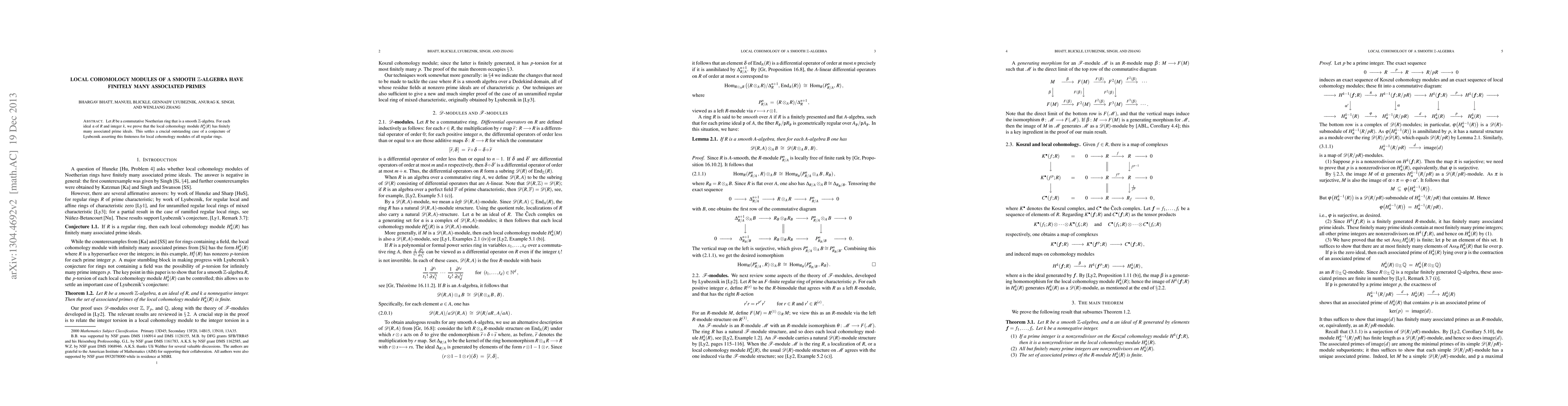This paper proves that local cohomology modules $H^k_I(R)$ of a smooth $\mathbb{Z}$-algebra $R$ have finitely many associated primes for any ideal $I$ and integer $k$, resolving a significant conjecture by Lyubeznik regarding local cohomology in regular rings.
