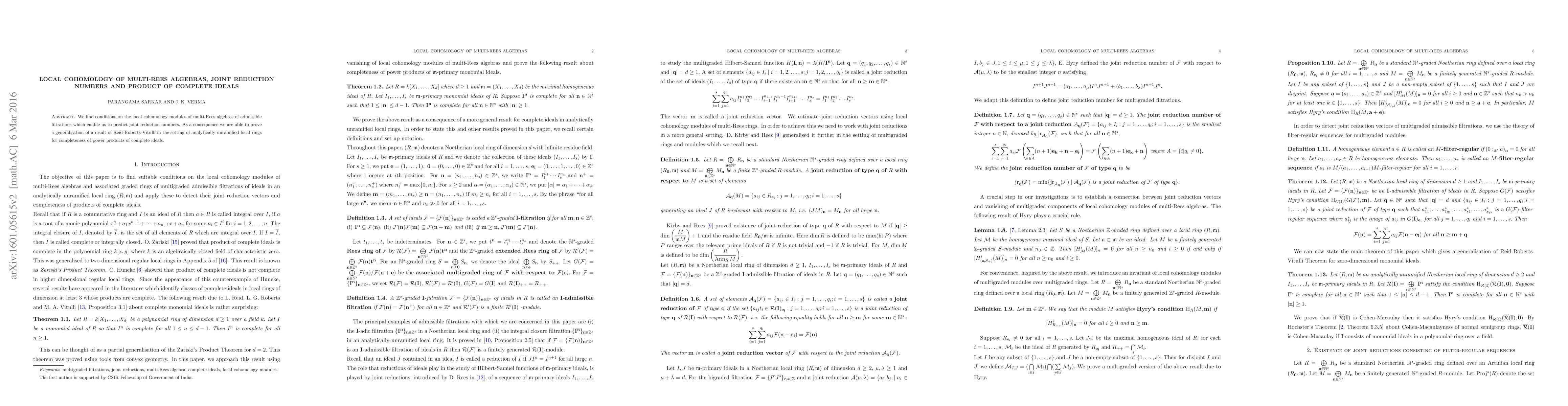 Summary: This paper establishes conditions for local cohomology modules in multi-Rees algebras that predict joint reduction numbers, leading to a generalization of Reid-Roberts-Vitulli's result on the completeness of power products of complete ideals in analytically unramified local rings.