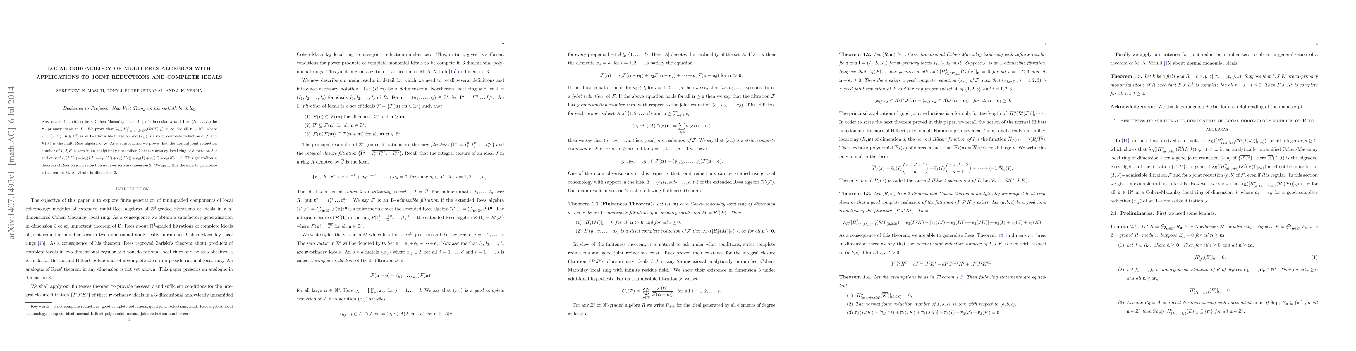 In this paper, we obtain a generalization, in dimension $3$, of a theorem of David Rees about joint reductions of the bigraded filtration $\{ \overline{I^rJ^s}\}$ of complete ${\mathfrak m}$-primary ideals and vanishing of the second normal Hilbert coefficient $\overline{e}_2(IJ)$ where $R$ is a two-dimensional Cohen-Macaulay analytically unramified local ring with maximal ideal $\mathfrak m.$ This generalization is obtained as a consequence of a formula for the third local cohomology module of the extended Rees algebras of the $\mathbb Z^3$-graded filtration $\{\overline{I^rJ^sK^t}\}$ with support in the ideal $(x_1t_1,x_2t_2,x_3t_3)$ where $(x_1,x_2,x_3)$ is a good joint reduction of $\{\overline{I^rJ^sK^t}\}.$