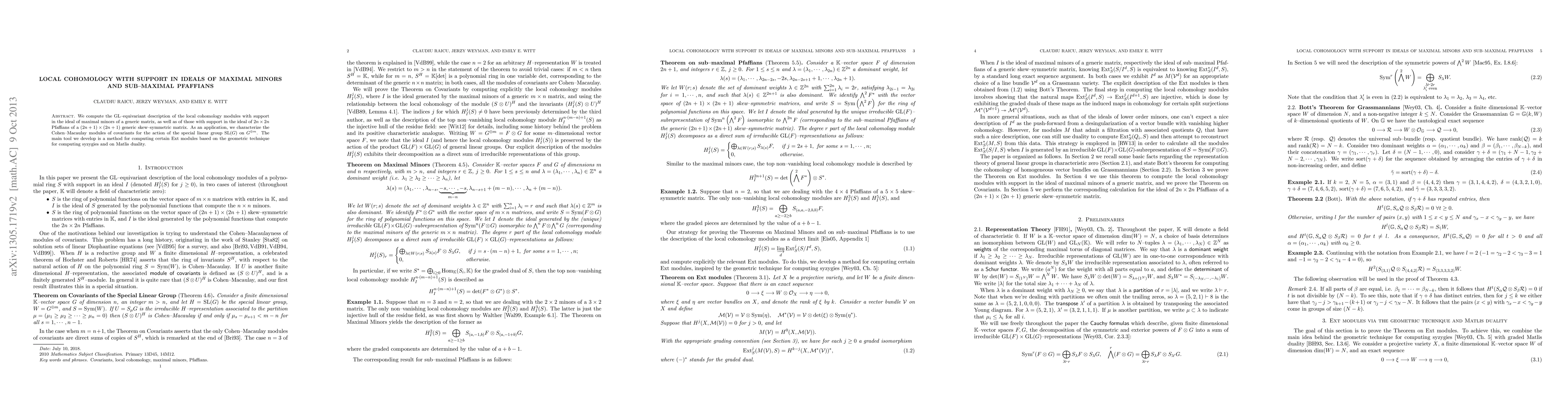 This paper computes the GL-equivariant local cohomology modules associated with maximal minors and sub-maximal Pfaffians, utilizing a new method for calculating Ext modules based on syzygies and Matlis duality. It also characterizes Cohen-Macaulay modules of covariants for the SL(G) action on G^m.