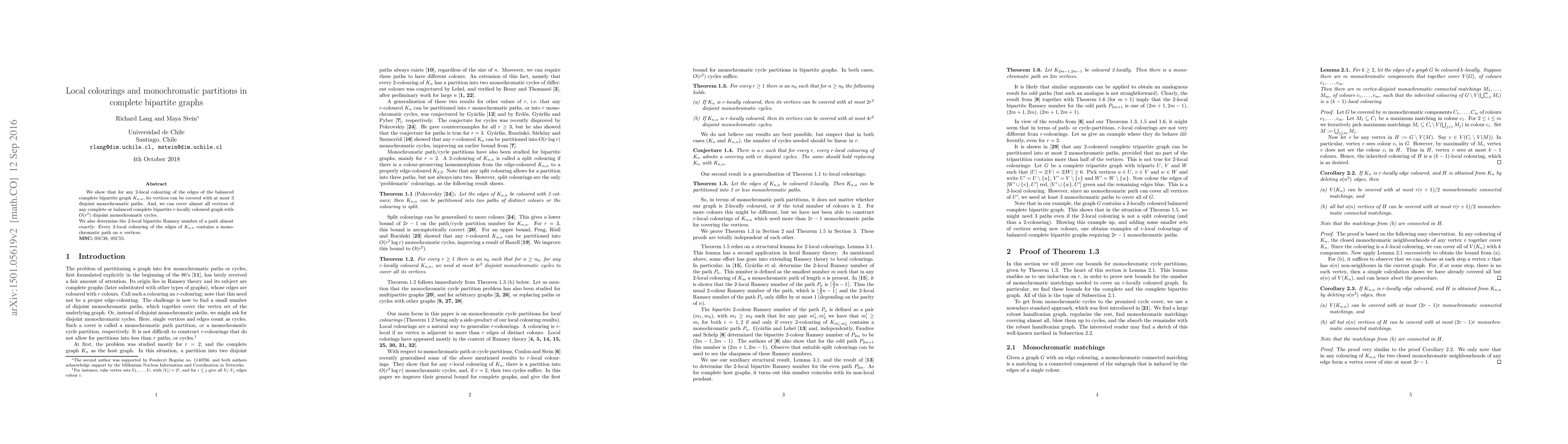 Summary: This paper demonstrates that any $2$-local edge colouring of the balanced complete bipartite graph $K_{n,n}$ allows for vertex coverage with at most $3$ disjoint monochromatic paths. It also shows that almost all vertices of $r$-locally coloured complete bipartite graphs can be covered with $O(r^2)$ disjoint monochromatic cycles, and determines the $2$-local bipartite Ramsey number for a path with high precision.
