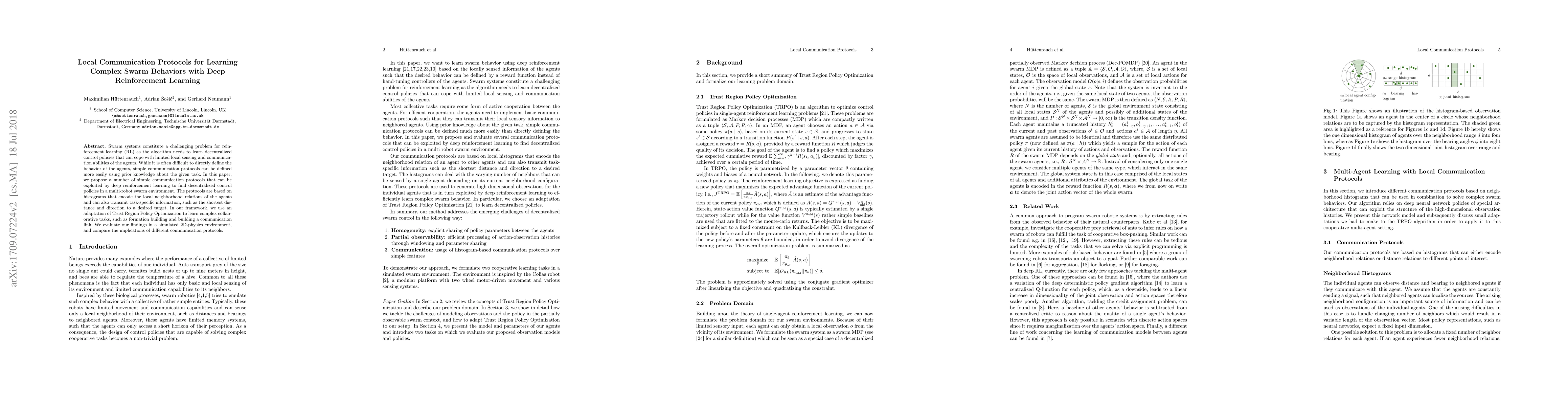 Swarm systems constitute a challenging problem for reinforcement learning (RL) as the algorithm needs to learn decentralized control policies that can cope with limited local sensing and communication abilities of the agents. While it is often difficult to directly define the behavior of the agents, simple communication protocols can be defined more easily using prior knowledge about the given task. In this paper, we propose a number of simple communication protocols that can be exploited by deep reinforcement learning to find decentralized control policies in a multi-robot swarm environment. The protocols are based on histograms that encode the local neighborhood relations of the agents and can also transmit task-specific information, such as the shortest distance and direction to a desired target. In our framework, we use an adaptation of Trust Region Policy Optimization to learn complex collaborative tasks, such as formation building and building a communication link. We evaluate our findings in a simulated 2D-physics environment, and compare the implications of different communication protocols.