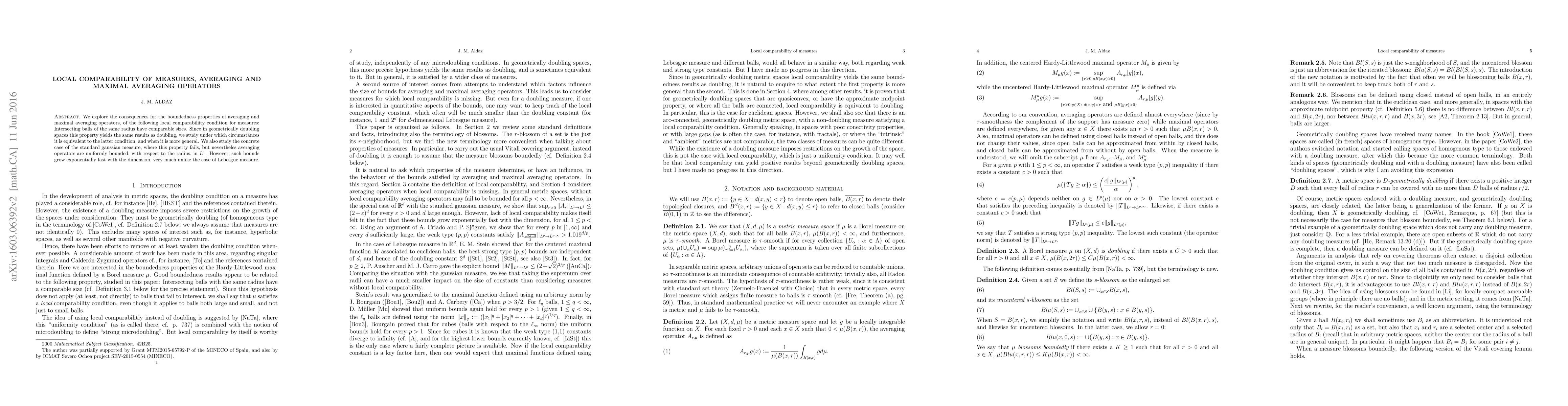 This paper investigates the boundedness of averaging and maximal averaging operators under a local comparability condition for measures, where intersecting balls of the same radius have comparable sizes. It compares this condition to the doubling property and examines its implications in geometrically doubling spaces, particularly focusing on the Gaussian measure where it fails but still maintains uniform $L^1$ bounds, albeit growing exponentially with dimension.