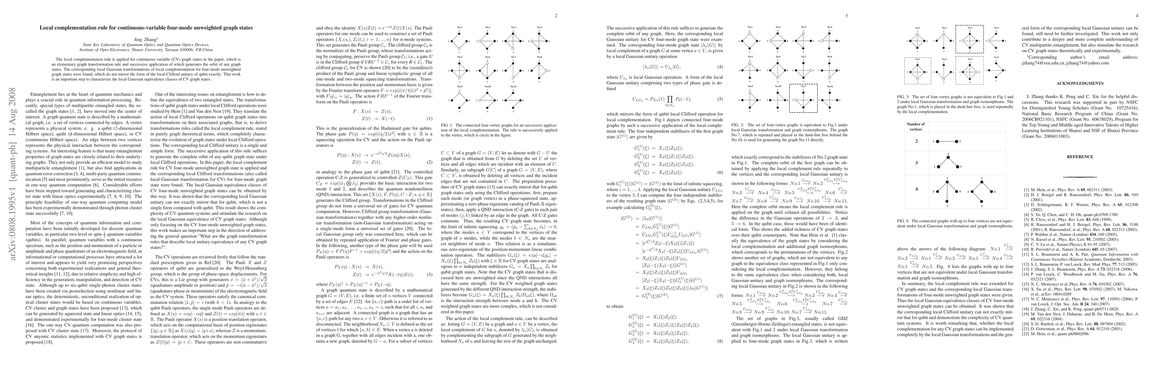 This paper applies the local complementation rule to continuous-variable four-mode unweighted graph states, identifying corresponding local Gaussian transformations that do not mirror the local Clifford unitary of qubits. This work advances the characterization of local Gaussian equivalence classes of CV graph states.