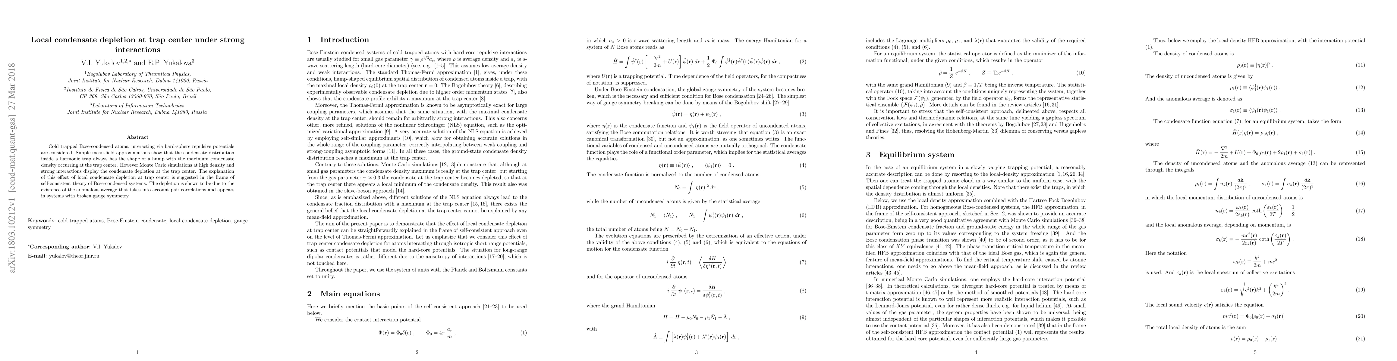 Cold trapped Bose-condensed atoms, interacting via hard-sphere repulsive potentials are considered. Simple mean-field approximations show that the condensate distribution inside a harmonic trap always has the shape of a hump with the maximum condensate density occurring at the trap center. However Monte Carlo simulations at high density and strong interactions display the condensate depletion at the trap center. The explanation of this effect of local condensate depletion at trap center is suggested in the frame of self-consistent theory of Bose-condensed systems. The depletion is shown to be due to the existence of the anomalous average that takes into account pair correlations and appears in systems with broken gauge symmetry.