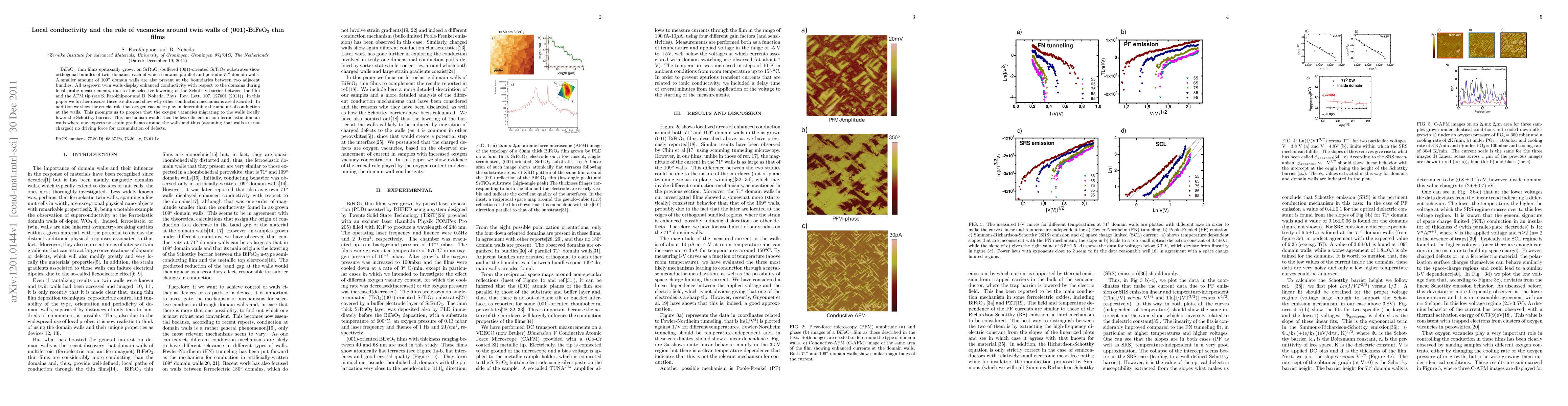 BiFeO3 thin films exhibit enhanced conductivity at twin walls due to the migration of oxygen vacancies, which lower the Schottky barrier between the film and the AFM tip. This conduction mechanism is more efficient in ferroelastic domain walls with strain gradients, while it is less effective in non-ferroelastic domain walls.
