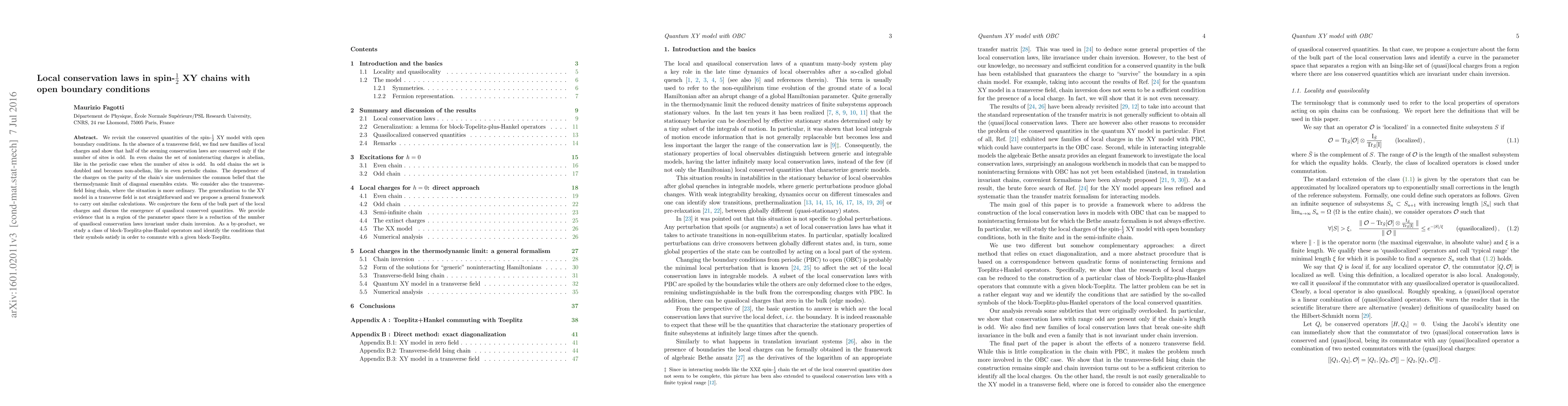 This paper explores conserved quantities in spin-1/2 XY chains with open boundary conditions, revealing that local conservation laws depend on the chain's parity. It proposes a framework for analyzing the XY model in a transverse field and discusses the implications for the thermodynamic limit of diagonal ensembles.