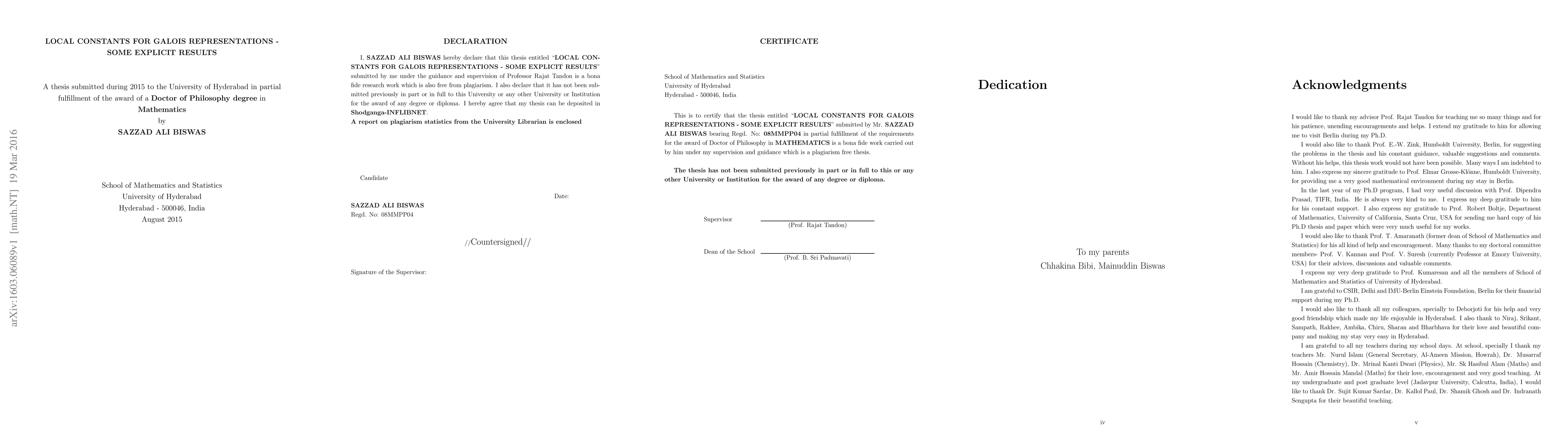 We can associate local constant to every continuous finite dimensional complex representation of the absolute Galois group $G_F$ of a non-archimedean local field $F/\mathbb{Q}_p$ by Deligne and Langlands. To give explicit formula of local constant of a representation, we need to compute $\lambda$-functions explicitly. In this thesis we compute $\lambda_{K/F}$ explicitly, where $K/F$ is a finite degree Galois extension of a non-archimedean local field $F$, except when $K/F$ is a wildly ramified quadratic extension with $F\ne\mathbb{Q}_2$. Then by using this $\lambda$-function computation, in general, we give an invariant formula of local constant of finite dimensional Heisenberg representations of the absolute Galois group $G_F$ of a non-archimedean local field $F$. But for explicit invariant formula of local constant for a Heisenberg representation, we should have information about the dimension of a Heisenberg representation and the arithmetic description of the determinant of a Heisenberg representation. In this thesis, we give explicit arithmetic description of the determinant of Heisenberg representation. We also construct all Heisenberg representations of dimensions prime to $p$, and study their various properties. By using $\lambda$-function computation and arithmetic description of the determinant of Heisenberg representations, we give an invariant formula of local constant for a Heisenberg representation of dimension prime to $p$.