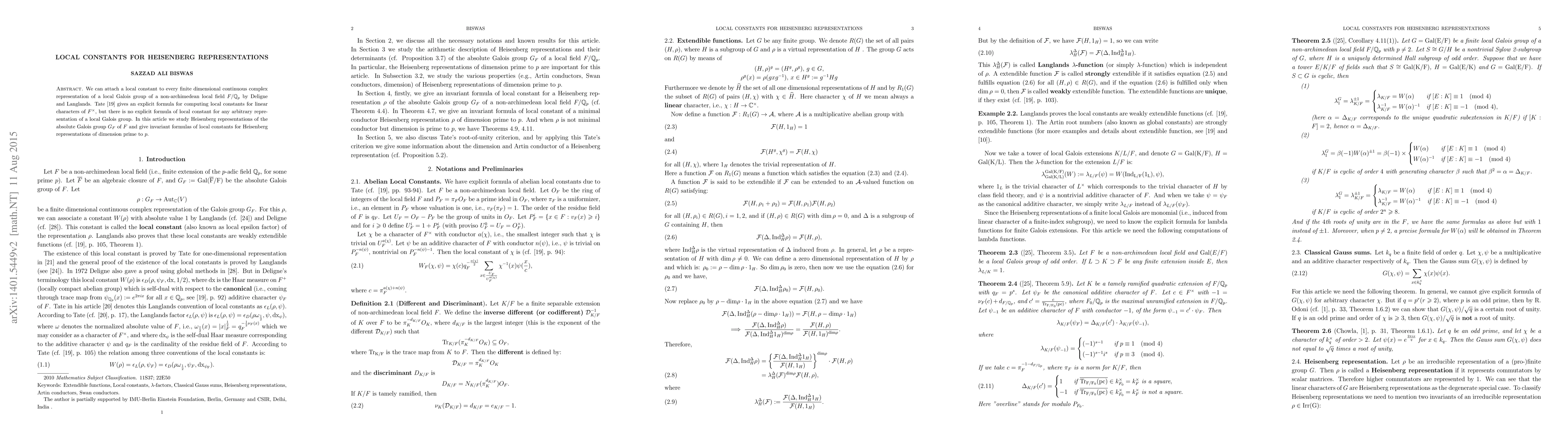 We can attach a local constant to every finite dimensional continuous complex representation of a local Galois group of a non-archimedean local field $F/\mathbb{Q}_p$ by Deligne and Langlands. Tate \cite{JT1} gives an explicit formula for computing local constants for linear characters of $F^\times$, but there is no explicit formula of local constant for any arbitrary representation of a local Galois group. In this article we study Heisenberg representations of the absolute Galois group $G_F$ of $F$ and give invariant formulas of local constants for Heisenberg representations of dimension prime to $p$.