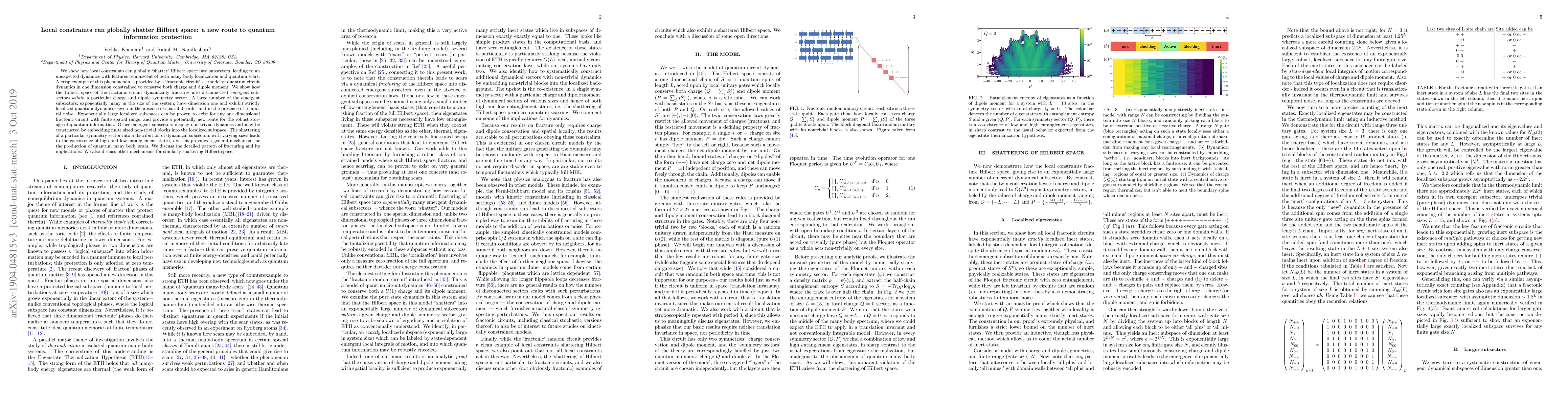 We show how local constraints can globally "shatter" Hilbert space into subsectors, leading to an unexpected dynamics with features reminiscent of both many body localization and quantum scars. A crisp example of this phenomenon is provided by a "fractonic circuit" - a model of quantum circuit dynamics in one dimension constrained to conserve both charge and dipole moment. We show how the Hilbert space of the fractonic circuit dynamically fractures into disconnected emergent subsectors within a particular charge and dipole symmetry sector. A large number of the emergent subsectors, exponentially many in the size of the system, have dimension one and exhibit strictly localized quantum dynamics---even in the absence of spatial disorder and in the presence of temporal noise. Exponentially large localized subspaces can be proven to exist for any one dimensional fractonic circuit with finite spatial range, and provide a potentially new route for the robust storage of quantum information. Other emergent subsectors display non-trivial dynamics and may be constructed by embedding finite sized non-trivial blocks into the localized subspace. The shattering of a particular symmetry sector into a distribution of dynamical subsectors with varying sizes leads to the coexistence of high and low entanglement states, i.e. this provides a general mechanism for the production of quantum many body scars. We discuss the detailed pattern of fracturing and its implications. We also discuss other mechanisms for similarly shattering Hilbert space.