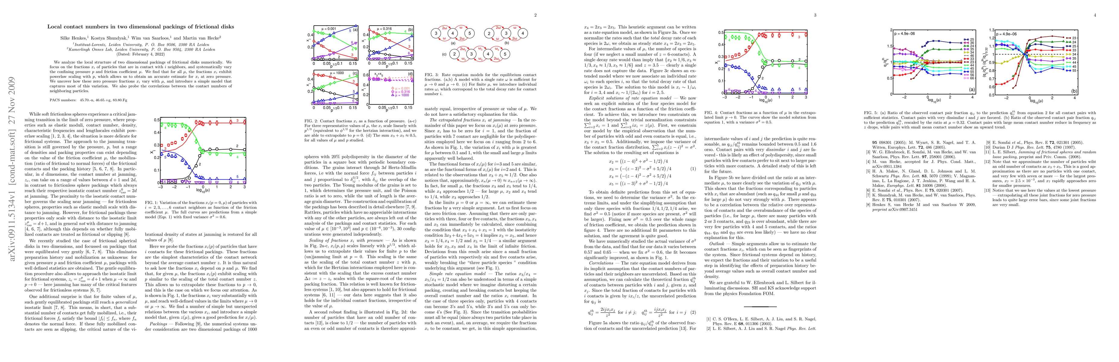 Researchers studied contact numbers in 2D packings of frictional disks, finding that contact fractions scale with pressure for all friction coefficients, allowing for accurate estimates at zero pressure.