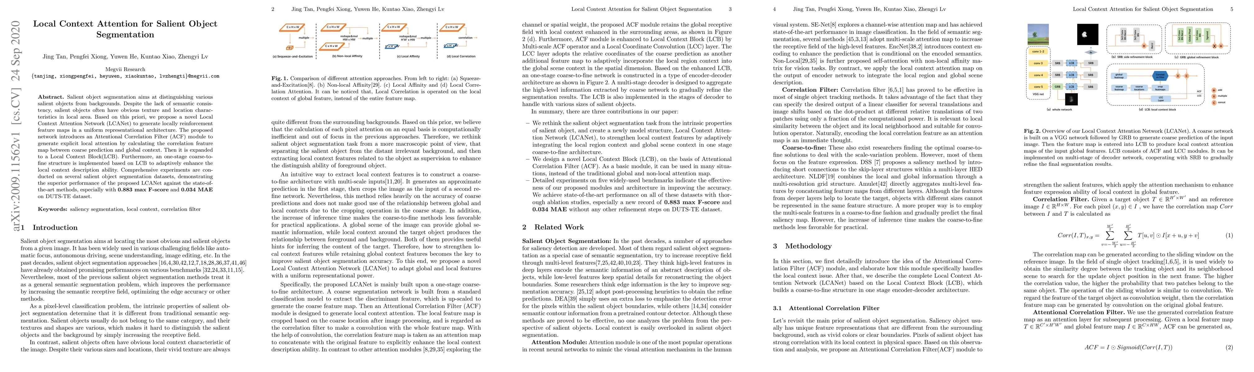 The paper proposes a Local Context Attention Network (LCANet) to enhance salient object segmentation by leveraging local context features. The LCANet utilizes an Attentional Correlation Filter module and a Local Context Block to generate and refine local attention maps, achieving superior performance with a max F-score of 0.883 and MAE of 0.034 on the DUTS-TE dataset.