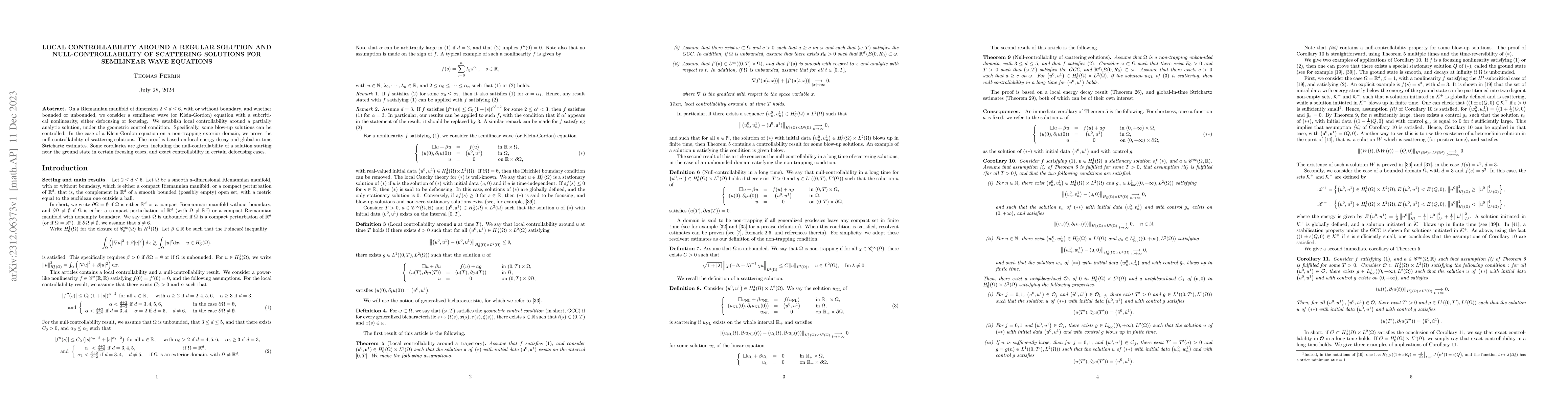 This paper investigates local controllability around regular solutions and null-controllability of scattering solutions for semilinear wave equations on Riemannian manifolds. It establishes local controllability under the geometric control condition and proves null-controllability for Klein-Gordon equations in non-trapping exterior domains, using local energy decay and Strichartz estimates.