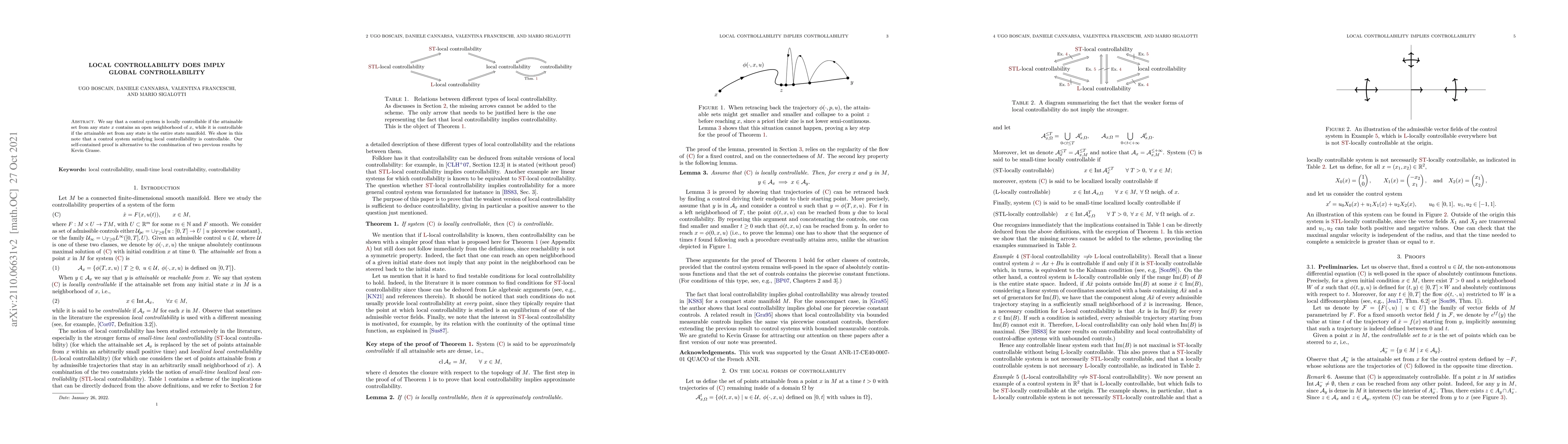 This paper demonstrates that local controllability in a control system implies global controllability, providing an alternative proof to previous results by Kevin Grasse. The study establishes that if a system can reach an open neighborhood from any state, it can reach the entire state manifold.
