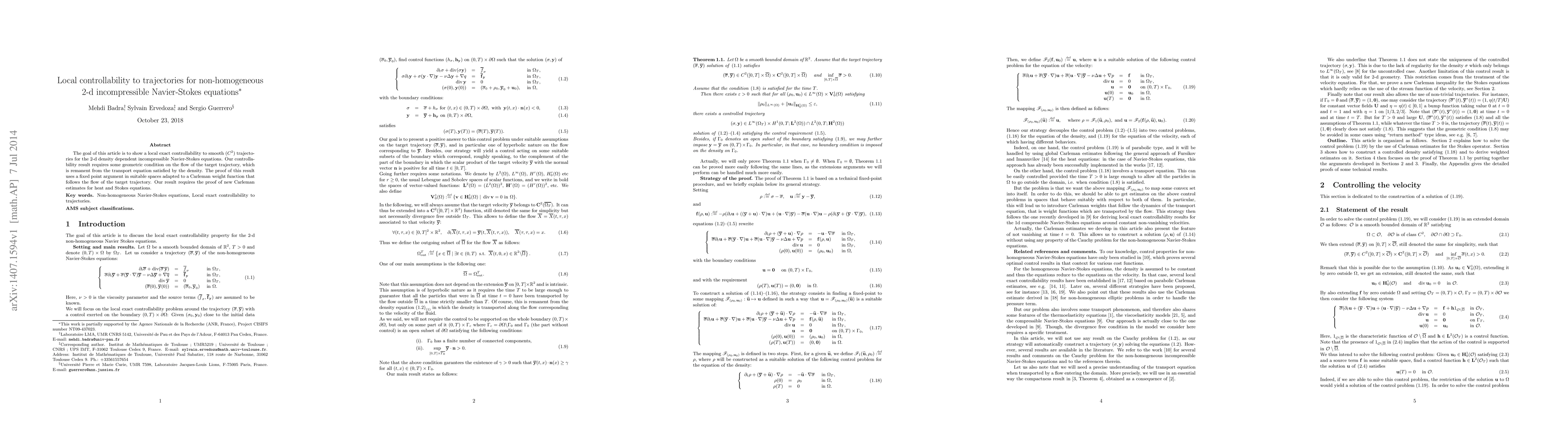 This paper demonstrates local exact controllability to smooth trajectories for 2-d density-dependent incompressible Navier-Stokes equations, utilizing a geometric condition on the target trajectory and proving new Carleman estimates for heat and Stokes equations to achieve a fixed point argument.