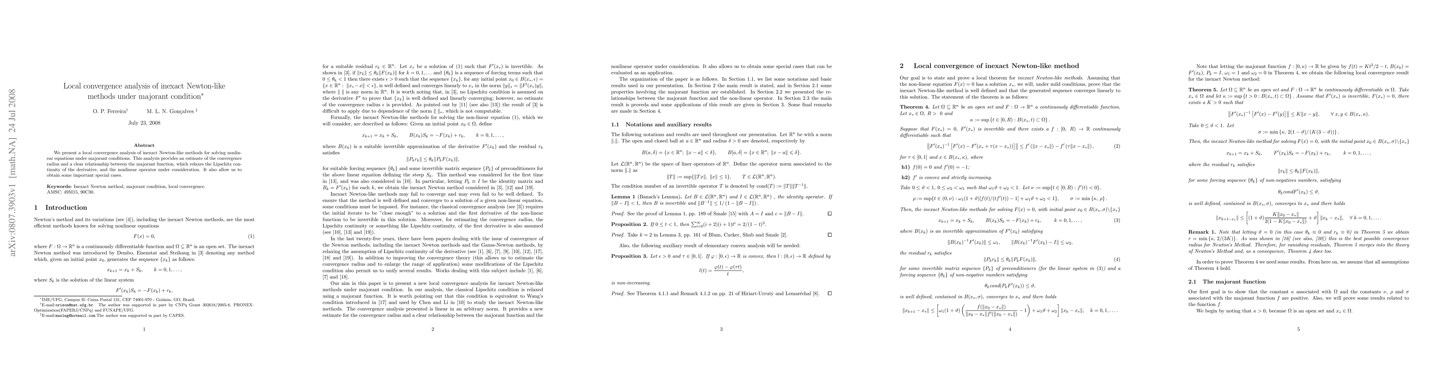 We present a local convergence analysis of inexact Newton-like methods for solving nonlinear equations under majorant conditions. This analysis provides an estimate of the convergence radius and a clear relationship between the majorant function, which relaxes the Lipschitz continuity of the derivative, and the nonlinear operator under consideration. It also allow us to obtain some important special cases
