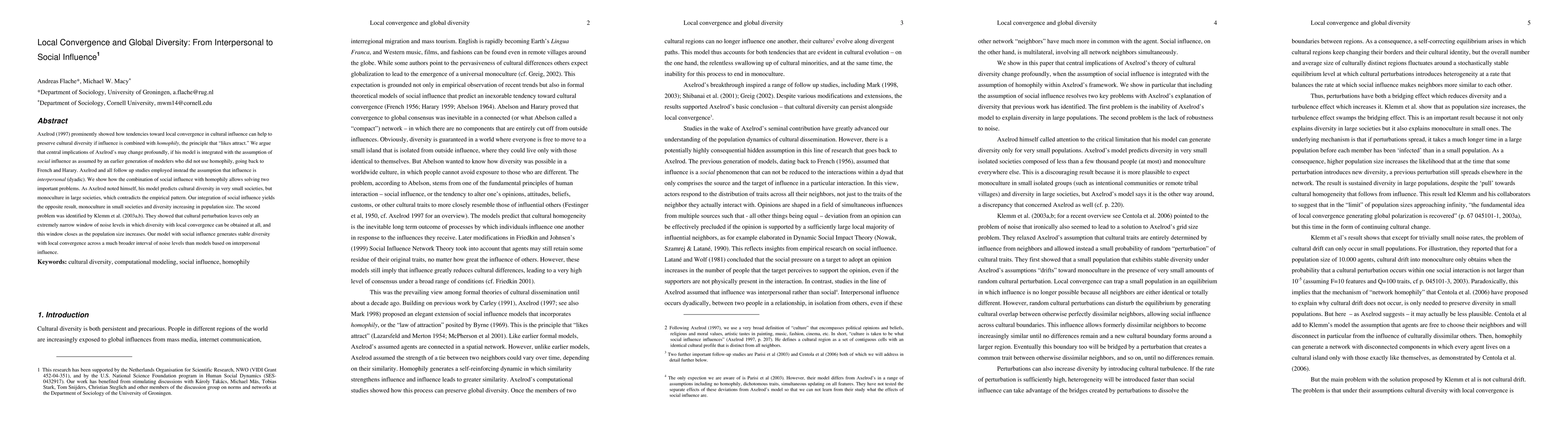 Axelrod (1997) showed how local convergence in cultural influence can preserve cultural diversity. We argue that central implications of Axelrod's model may change profoundly, if his model is integrated with the assumption of social influence as assumed by an earlier generation of modelers. Axelrod and all follow up studies employed instead the assumption that influence is interpersonal (dyadic). We show how the combination of social influence with homophily allows solving two important problems. Our integration of social influence yields monoculture in small societies and diversity increasing in population size, consistently with empirical evidence but contrary to earlier models. The second problem was identified by Klemm et al.(2003a,b), an extremely narrow window of noise levels in which diversity with local convergence can be obtained at all. Our model with social influence generates stable diversity with local convergence across a much broader interval of noise levels than models based on interpersonal influence.