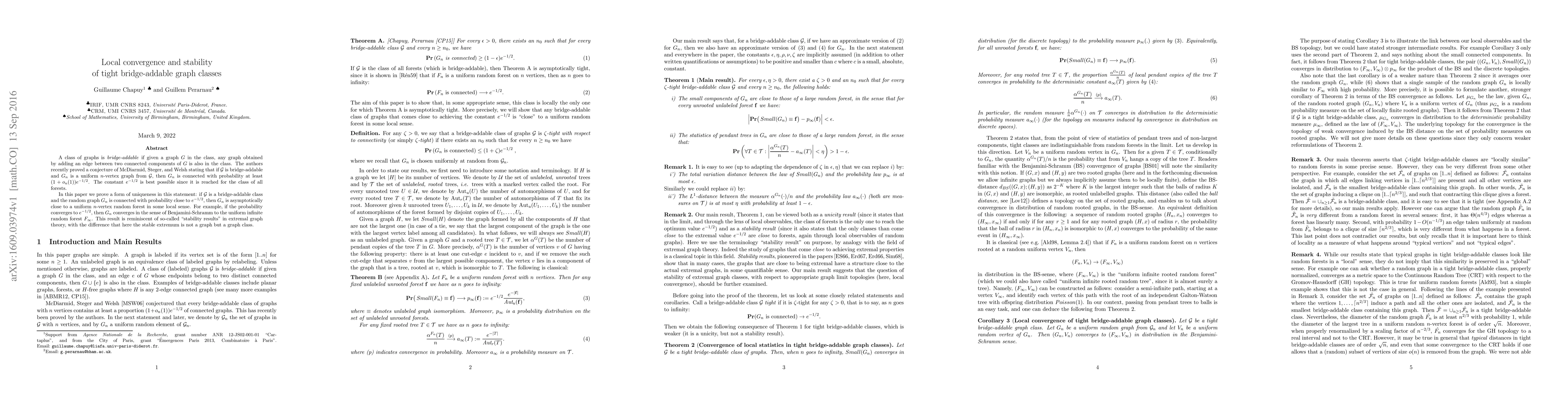 Researchers prove that if a graph class is bridge-addable and its random graphs converge to a probability of e^-1/2, then the graph converges to a uniform forest in some local sense.
