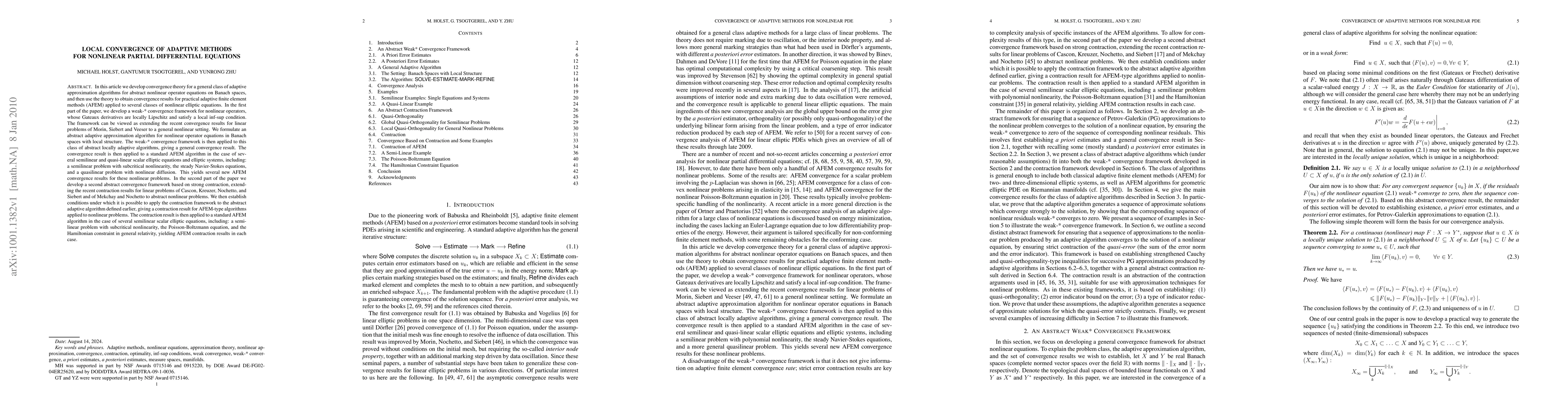 In this article we develop convergence theory for a general class of adaptive approximation algorithms for abstract nonlinear operator equations on Banach spaces, and use the theory to obtain convergence results for practical adaptive finite element methods (AFEM) applied to several classes of nonlinear elliptic equations. In the first part of the paper, we develop a weak-* convergence framework for nonlinear operators, whose Gateaux derivatives are locally Lipschitz and satisfy a local inf-sup condition. The framework can be viewed as extending the recent convergence results for linear problems of Morin, Siebert and Veeser to a general nonlinear setting. We formulate an abstract adaptive approximation algorithm for nonlinear operator equations in Banach spaces with local structure. The weak-* convergence framework is then applied to this class of abstract locally adaptive algorithms, giving a general convergence result. The convergence result is then applied to a standard AFEM algorithm in the case of several semilinear and quasi-linear scalar elliptic equations and elliptic systems, including: a semilinear problem with subcritical nonlinearity, the steady Navier-Stokes equations, and a quasilinear problem with nonlinear diffusion. This yields several new AFEM convergence results for these nonlinear problems. In the second part of the paper we develop a second abstract convergence framework based on strong contraction, extending the recent contraction results for linear problems of Cascon, Kreuzer, Nochetto, and Siebert and of Mekchay and Nochetto to abstract nonlinear problems. The contraction result is then applied to a standard AFEM algorithm for semilinear problems with sub- and super-critical nonlinearities and for the Hamiltonian constraint in general relativity.
