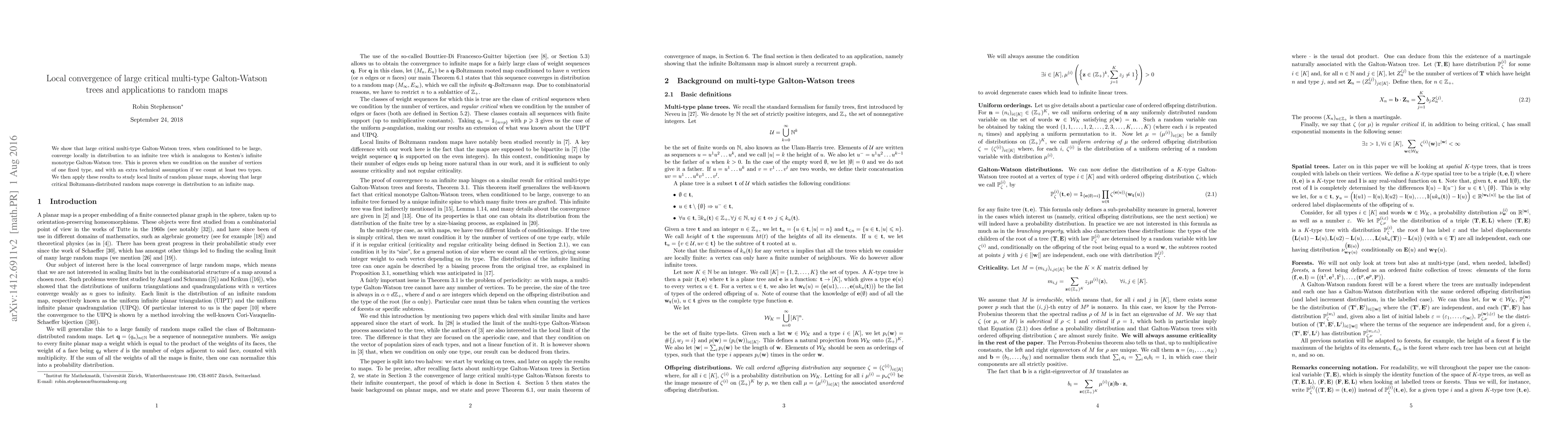 Large critical multi-type Galton-Watson trees converge locally to an infinite tree under certain conditions, with implications for random planar maps.