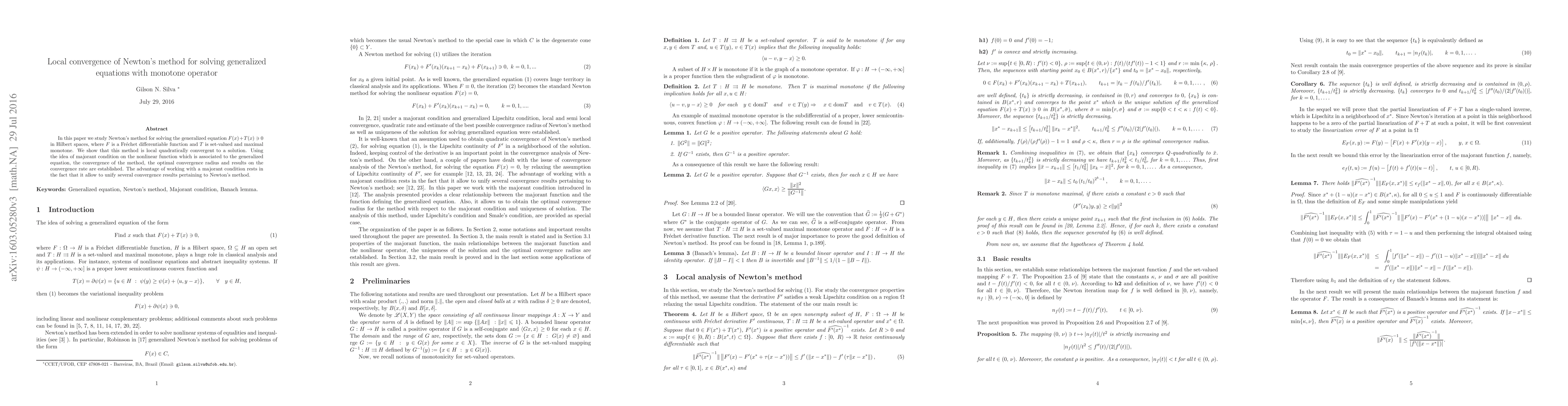 This paper investigates the local quadratic convergence of Newton's method for solving generalized equations in Hilbert spaces, where $F$ is differentiable and $T$ is maximal monotone. It establishes convergence under a majorant condition, demonstrating the method's optimal convergence radius and rate.