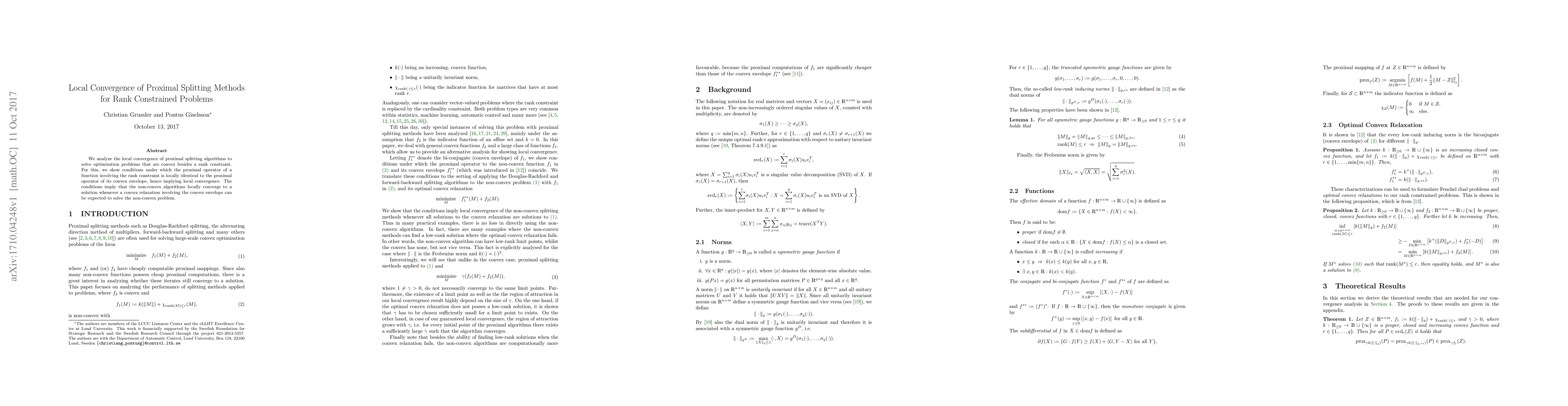 This paper examines the local convergence of proximal splitting methods for convex optimization problems with rank constraints. It establishes conditions under which the proximal operator of a rank-constrained function matches that of its convex envelope, ensuring local convergence to a solution.