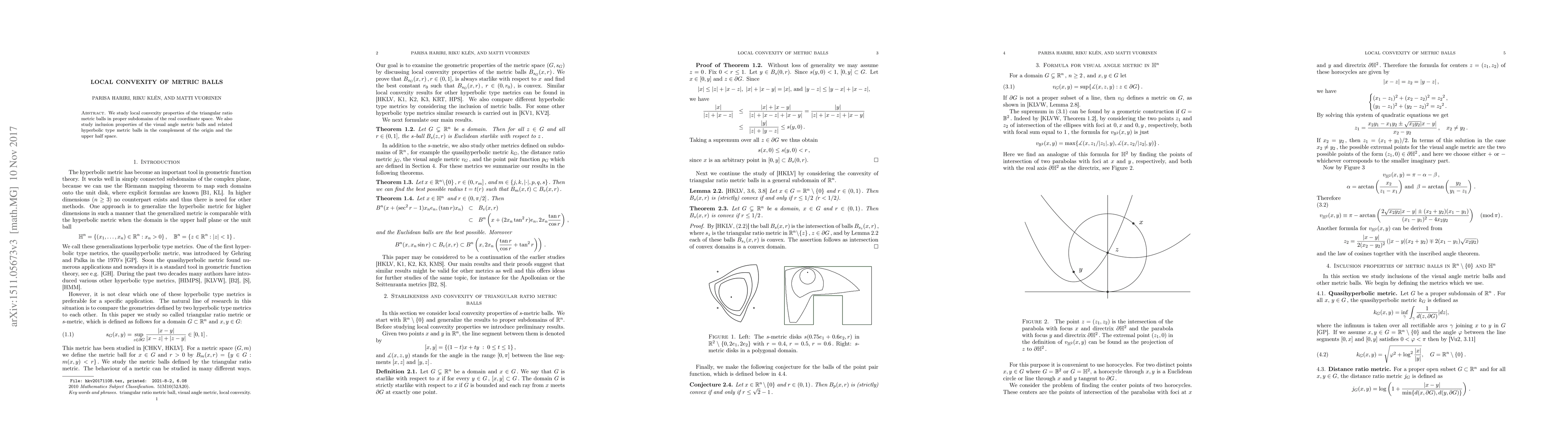 Summary: This paper investigates local convexity in triangular ratio metric balls within proper subdomains of real coordinate space, and examines inclusion properties of visual angle metric balls and hyperbolic type metric balls in the complement of the origin and the upper half space.