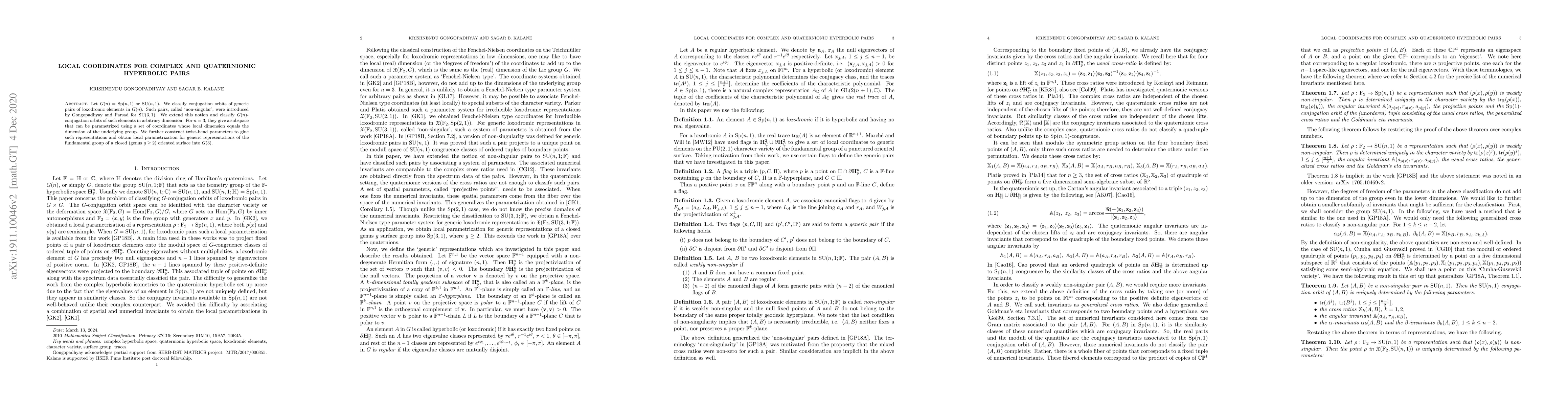 Let $G(n)={\rm Sp}(n,1)$ or ${\rm SU}(n,1)$. We classify conjugation orbits of generic pairs of loxodromic elements in $G(n)$. Such pairs, called `non-singular', were introduced by Gongopadhyay and Parsad for ${\rm SU}(3,1)$. We extend this notion and classify $G(n)$-conjugation orbits of such elements in arbitrary dimension. We prove that the set given by non-singular pairs in $G(n)$ is `small' for $n \geq 4$. However, for $n=3$, they give a subspace that can be parametrized using a set of coordinates whose local dimension equals the dimension of the underlying group. We further construct twist-bend parameters to glue such representations and obtain local parametrization for generic representations of the fundamental group of a closed oriented surface into $G(3)$.