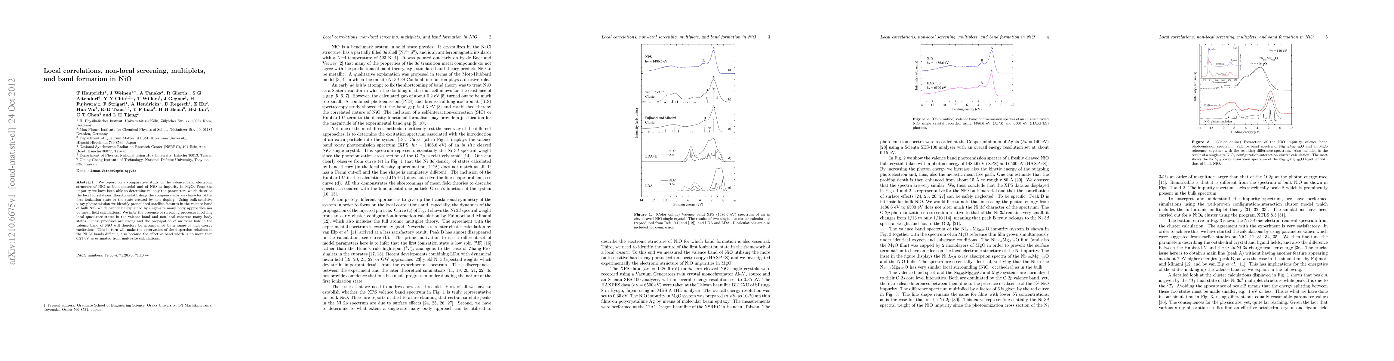 We report on a comparative study of the valence band electronic structure of NiO as bulk material and of NiO as impurity in MgO. From the impurity we have been able to determine reliably the parameters which describe the local correlations, thereby establishing the compensated-spin character of the first ionization state or the state created by hole doping. Using bulk-sensitive x-ray photoemission we identify pronounced satellite features in the valence band of bulk NiO which cannot be explained by single-site many body approaches nor by mean field calculations. We infer the presence of screening processes involving local quasi-core states in the valence band and non-local coherent many body states. These processes are strong and the propagation of an extra hole in the valence band of NiO will therefore be accompanied by a range of high energy excitations. This in turn will make the observation of the dispersion relations in the Ni 3d bands difficult, also because the effective band width is no more than 0.25 eV as estimated from multi-site calculations.