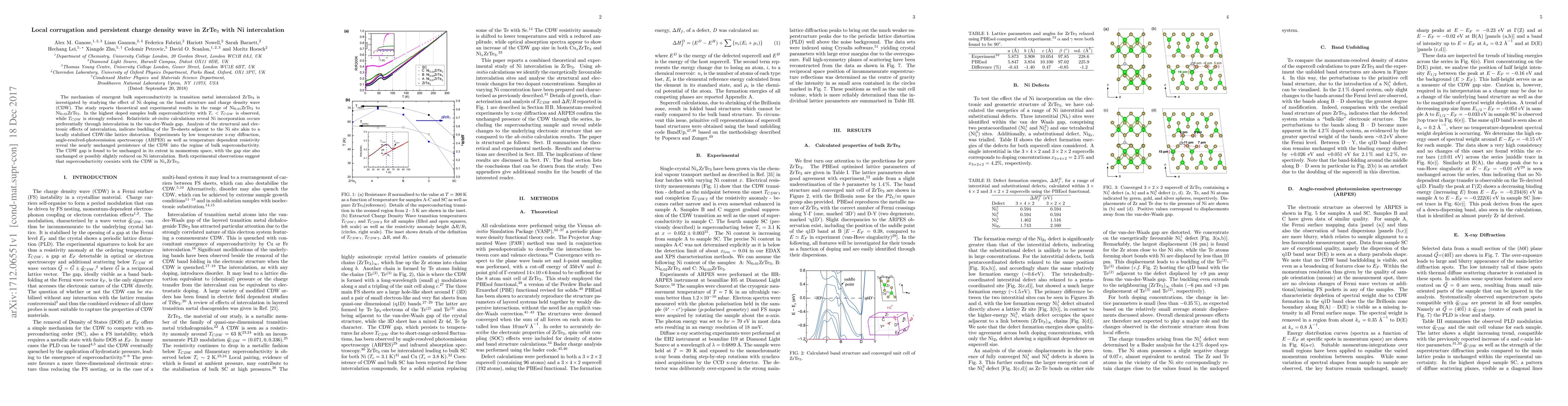The mechanism of emergent bulk superconductivity in transition metal intercalated ZrTe3 is investigated by studying the effect of Ni doping on the band structure and charge density wave (CDW). The study reports theoretical and experimental results in the range of Ni0.01ZrTe3 to Ni0.05ZrTe3. In the highest doped samples bulk superconductivity with Tc < TCDW is observed, while TCDW is strongly reduced. Relativistic ab-initio calculations reveal Ni incorporation occurs preferentially through intercalation in the van-der-Waals gap. Analysis of the structural and elec- tronic effects of intercalation, indicate buckling of the Te-sheets adjacent to the Ni site akin to a locally stabilised CDW-like lattice distortion. Experiments by low temperature x-ray diffraction, angle-resolved-photoemission spectroscopy (ARPES) as well as temperature dependent resistivity reveal the nearly unchanged persistence of the CDW into the regime of bulk superconductivity. The CDW gap is found to be unchanged in its extent in momentum space, with the gap size also unchanged or possibly slightly reduced on Ni intercalation. Both experimental observations suggest that superconductivity coexists with the CDW in NixZrTe3.