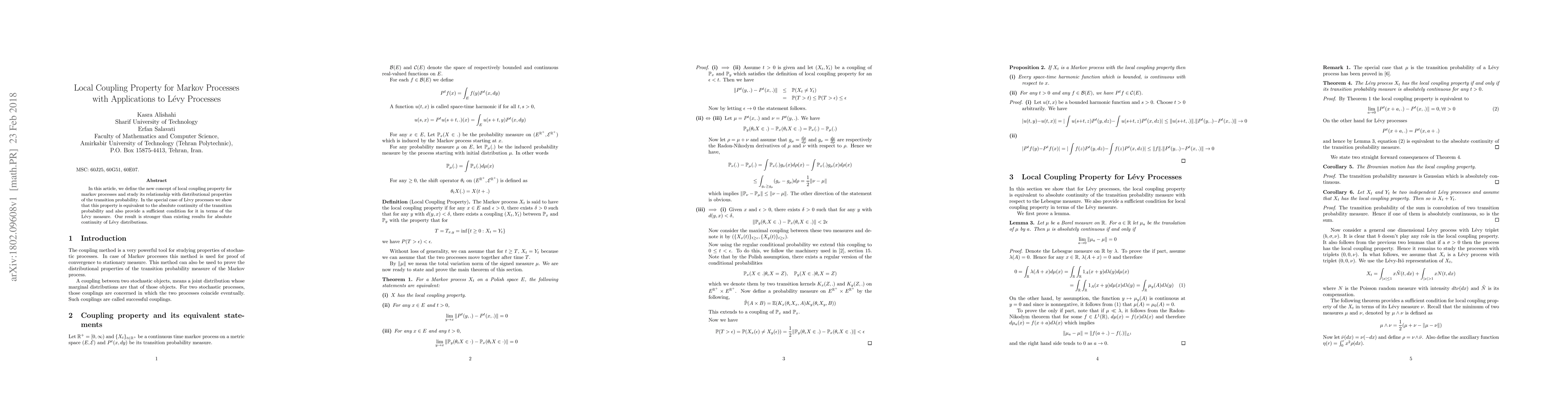 This paper introduces the local coupling property for Markov processes and explores its implications, particularly showing its equivalence to the absolute continuity of the transition probability for Lévy processes. It also provides a new sufficient condition for this property in terms of the Lévy measure, surpassing existing results.