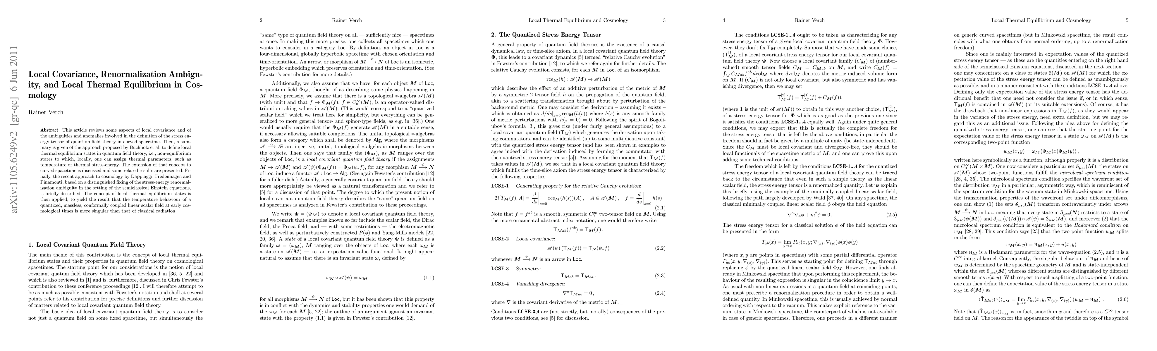 This paper reviews local covariance issues and renormalization ambiguities in quantum field theory in curved spacetime. It proposes a method for defining local thermal equilibrium states and extends this to curved spacetime, showing that early cosmological times exhibit more singular temperature behavior for a quantized scalar field than classical radiation.