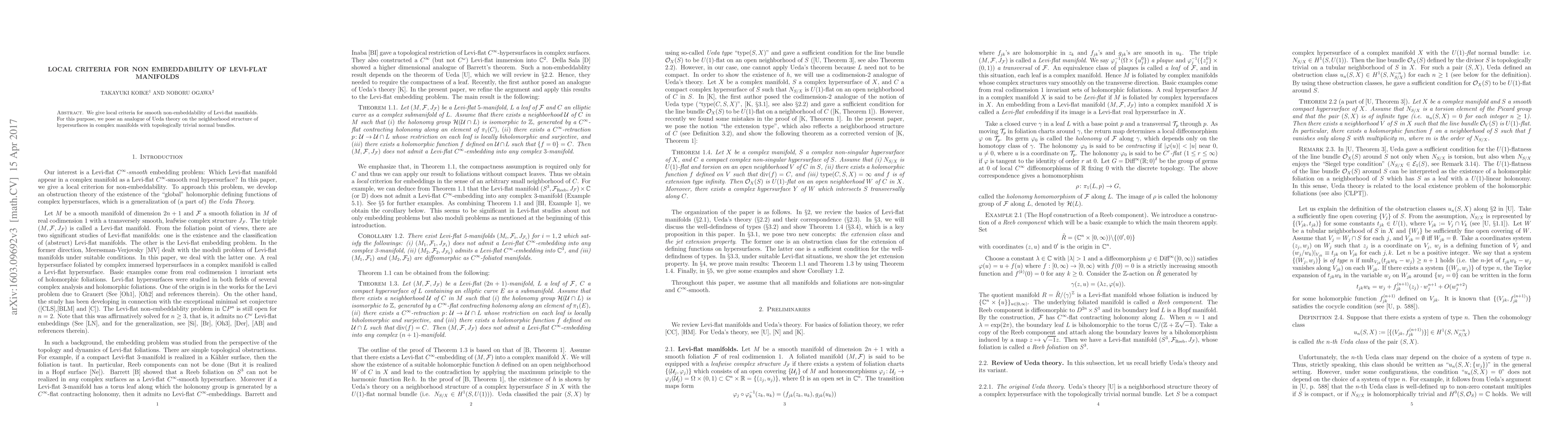 This paper provides local criteria to determine the smooth non-embeddability of Levi-flat manifolds, drawing on an analogue of Ueda theory to analyze the neighborhood structure of such manifolds in complex environments with trivial normal bundles.